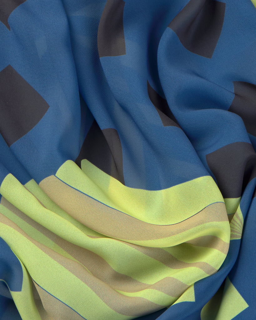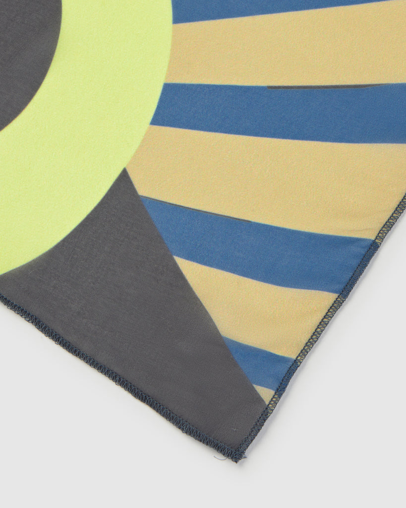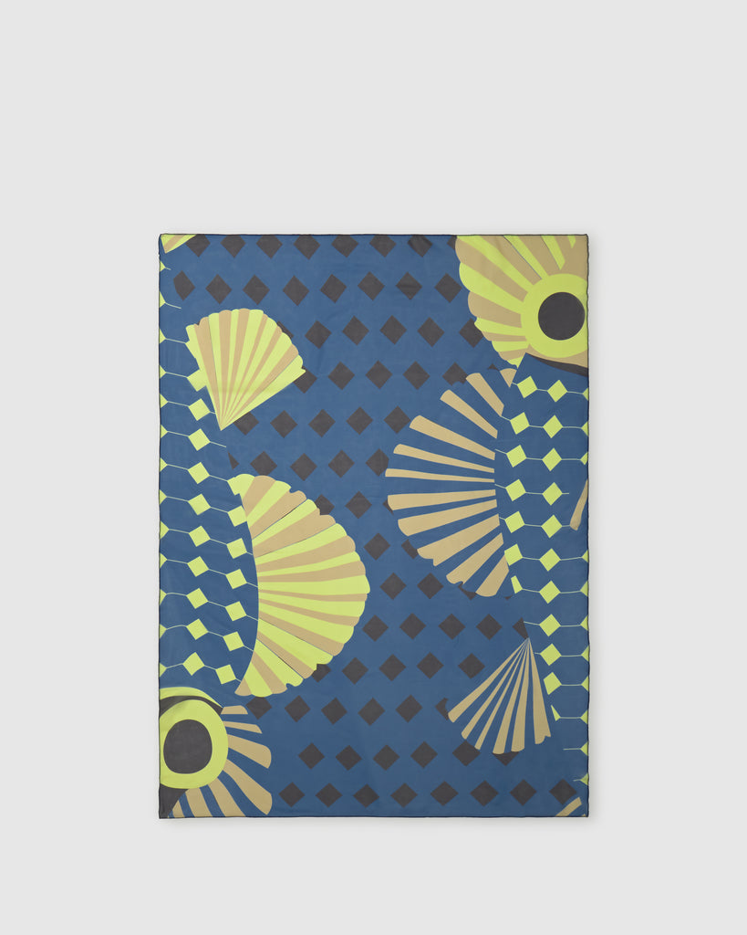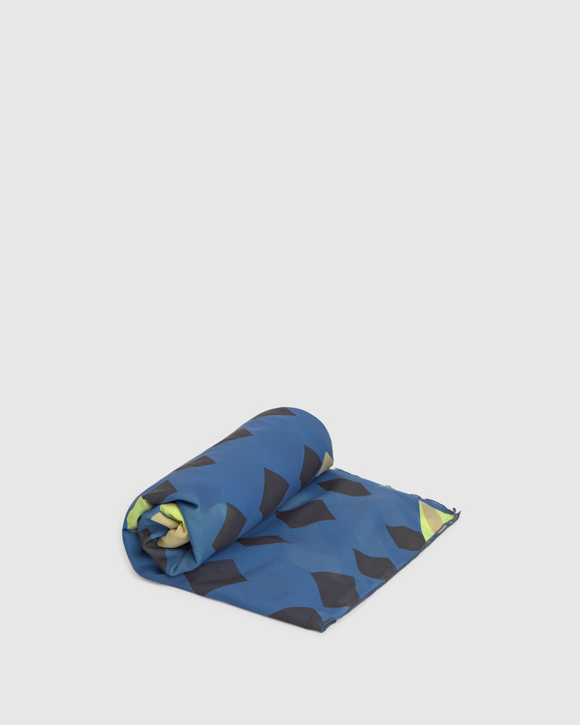 Pareo Perca en tejido fluido de origen vegetal. Estampado gráfico en tonos azules y amarillos. Acabado con ribete fino a tono. Tacto suave y vaporoso.