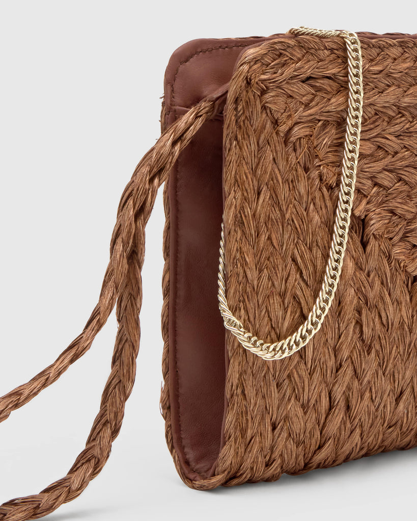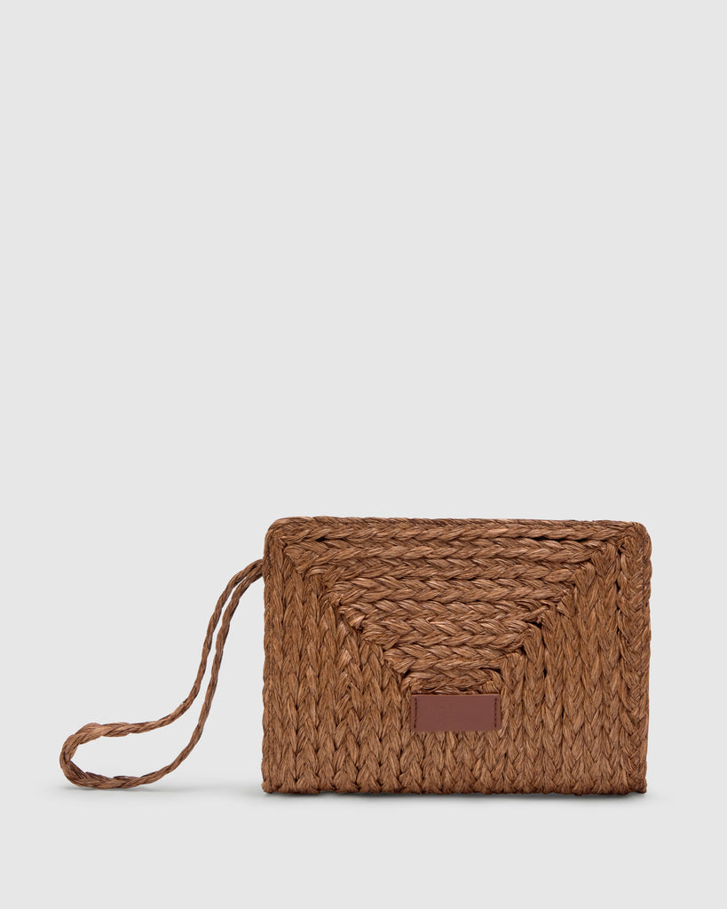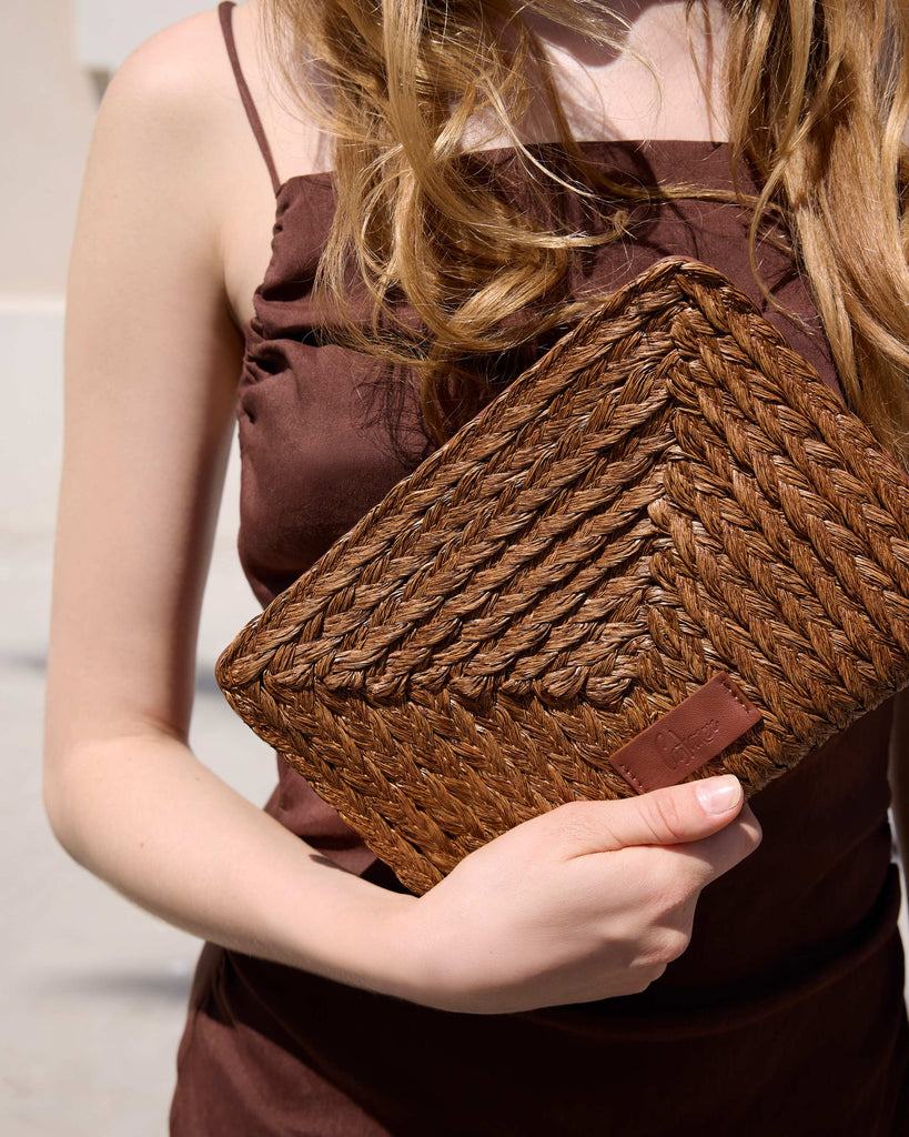 Bolso de mano Bali estilo pochette en rafia natural tintada con cierre de cremallera y asa para la muñeca y el hombro.