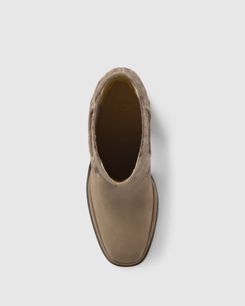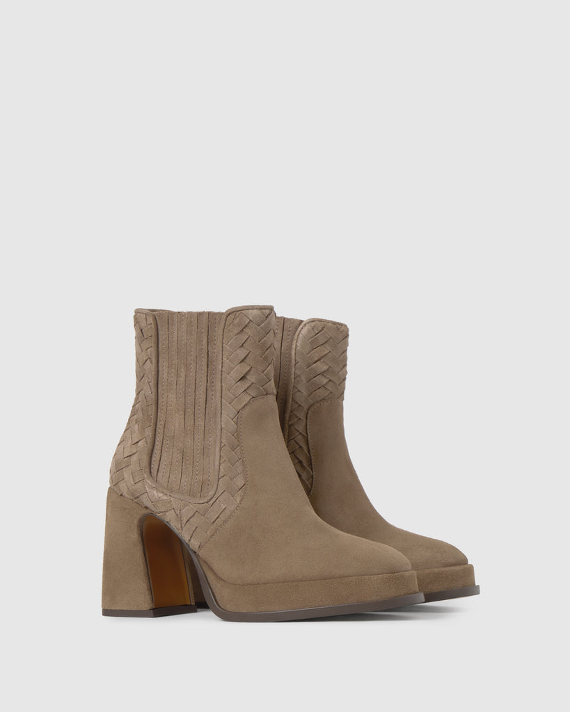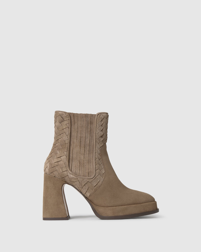 Botín Blanche en serraje con detalle intrecciato en la caña, cierre elástico, plantilla acolchada y tacón geométrico de 10cm forrado a juego.