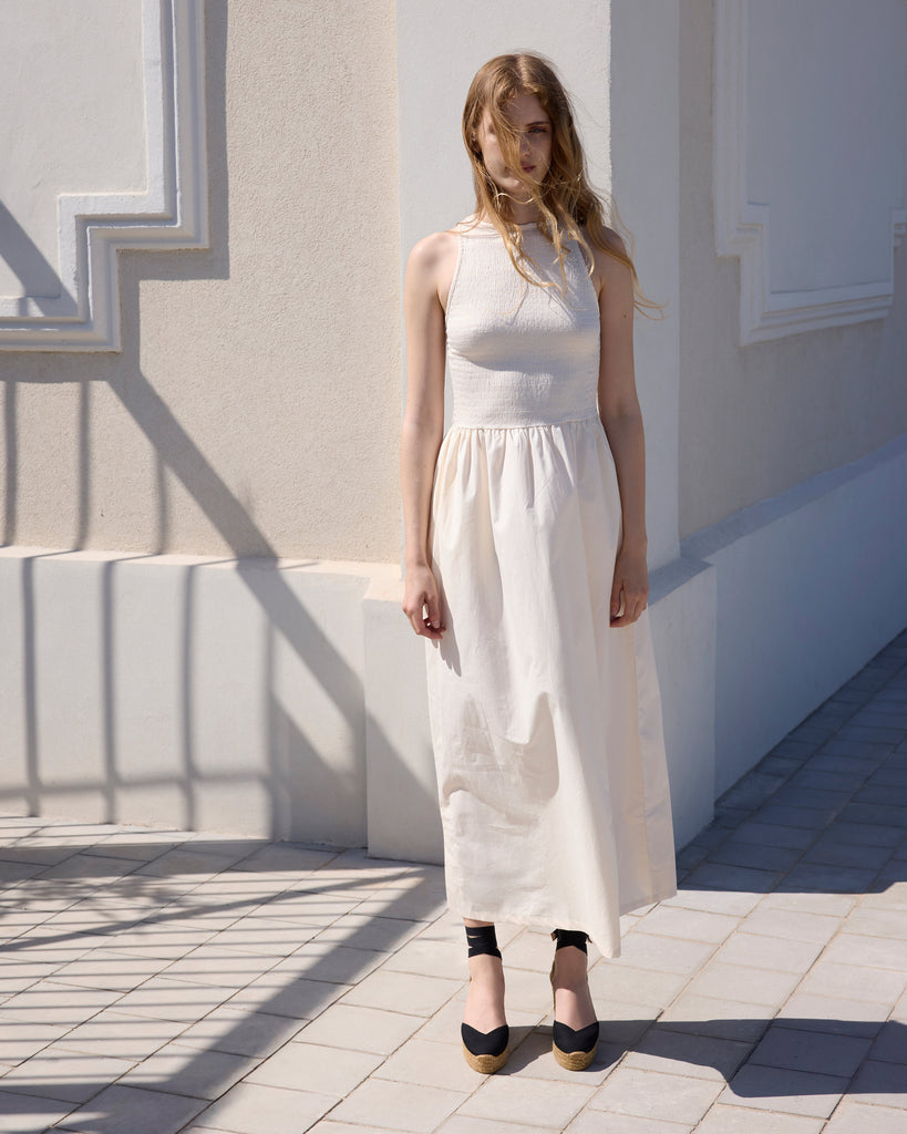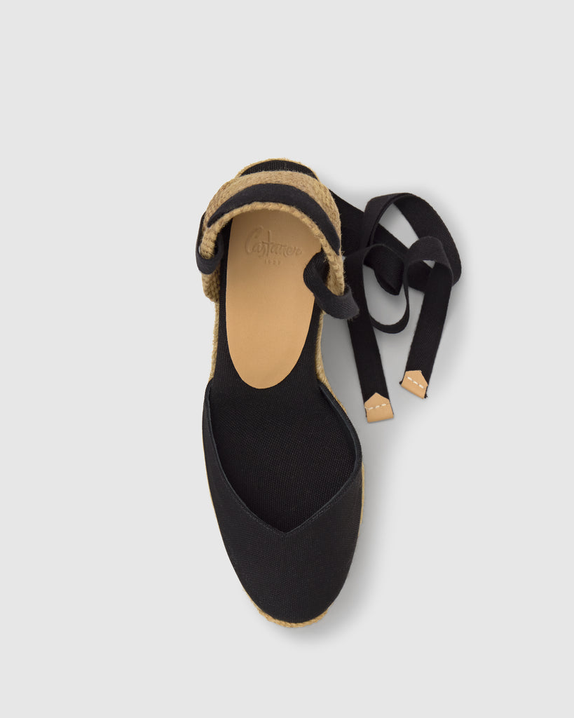 Icónica alpargata Chiara en algodón orgánico con cierre de cintas, plantilla acolchada y escote en V. Cuña de yute taupe de 11cm con doble plataforma.
