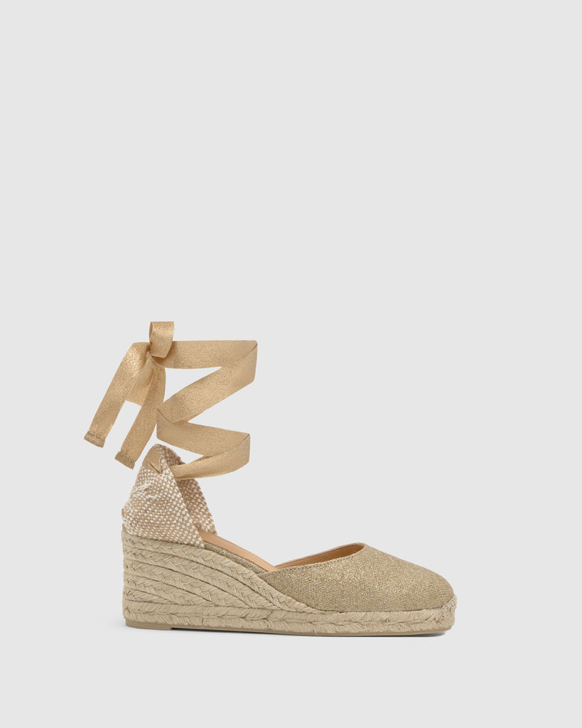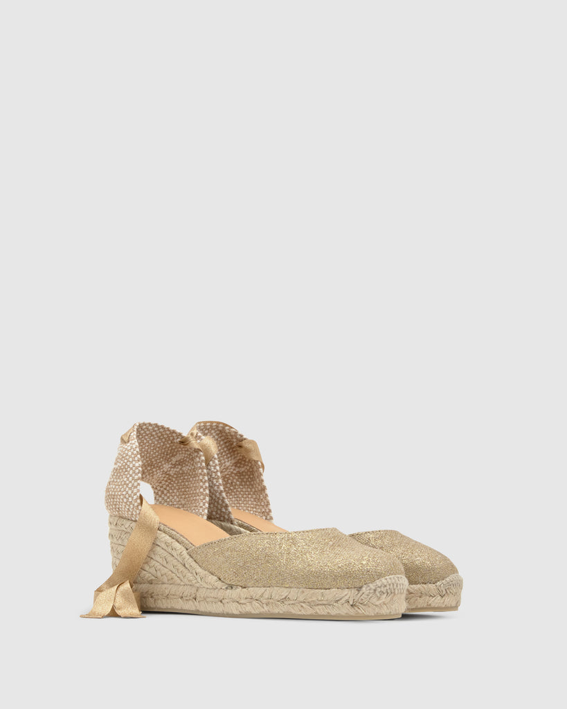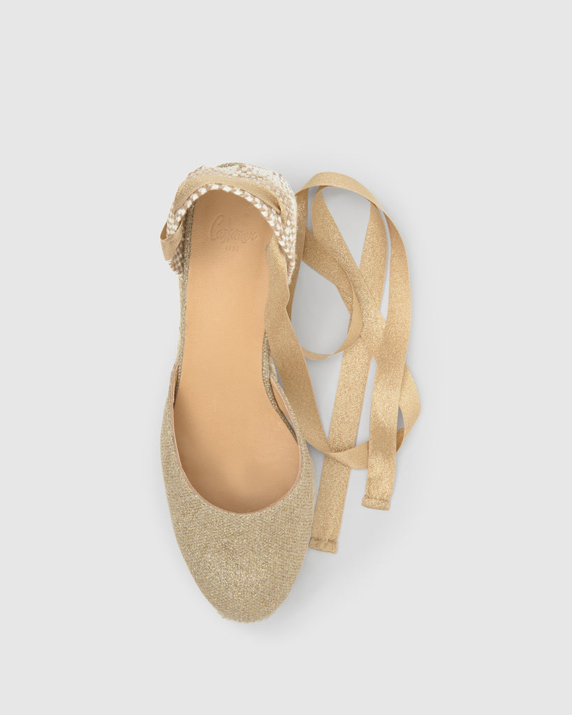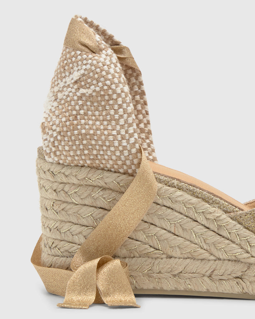 Icónica alpargata Carina en lino metalizado con cierre de lazada, plantilla acolchada y cuña de yute y lurex de 7cm.