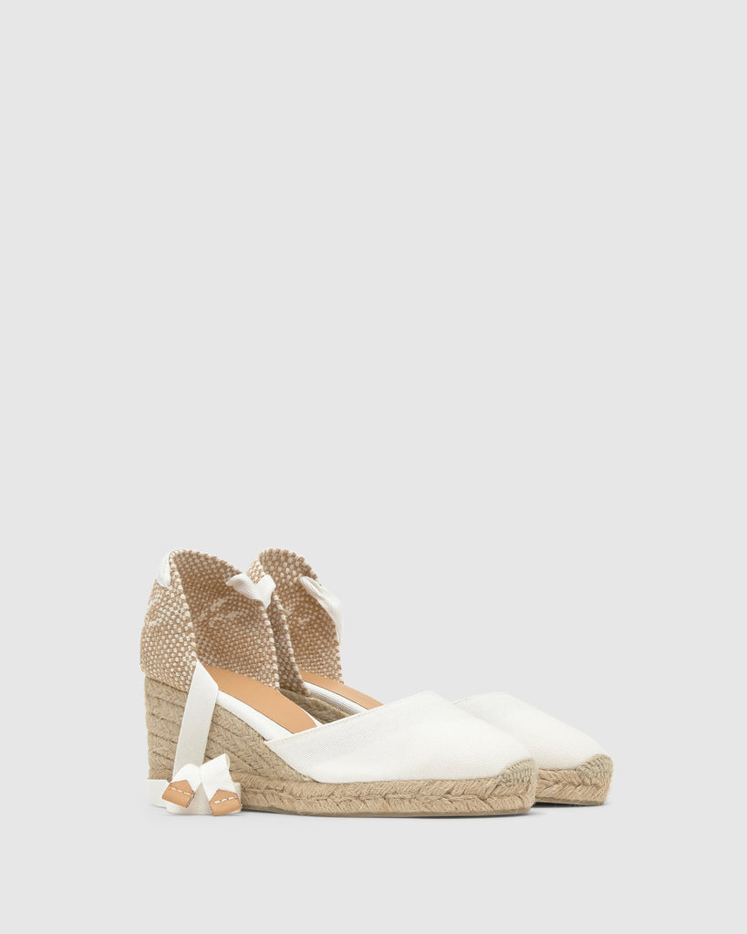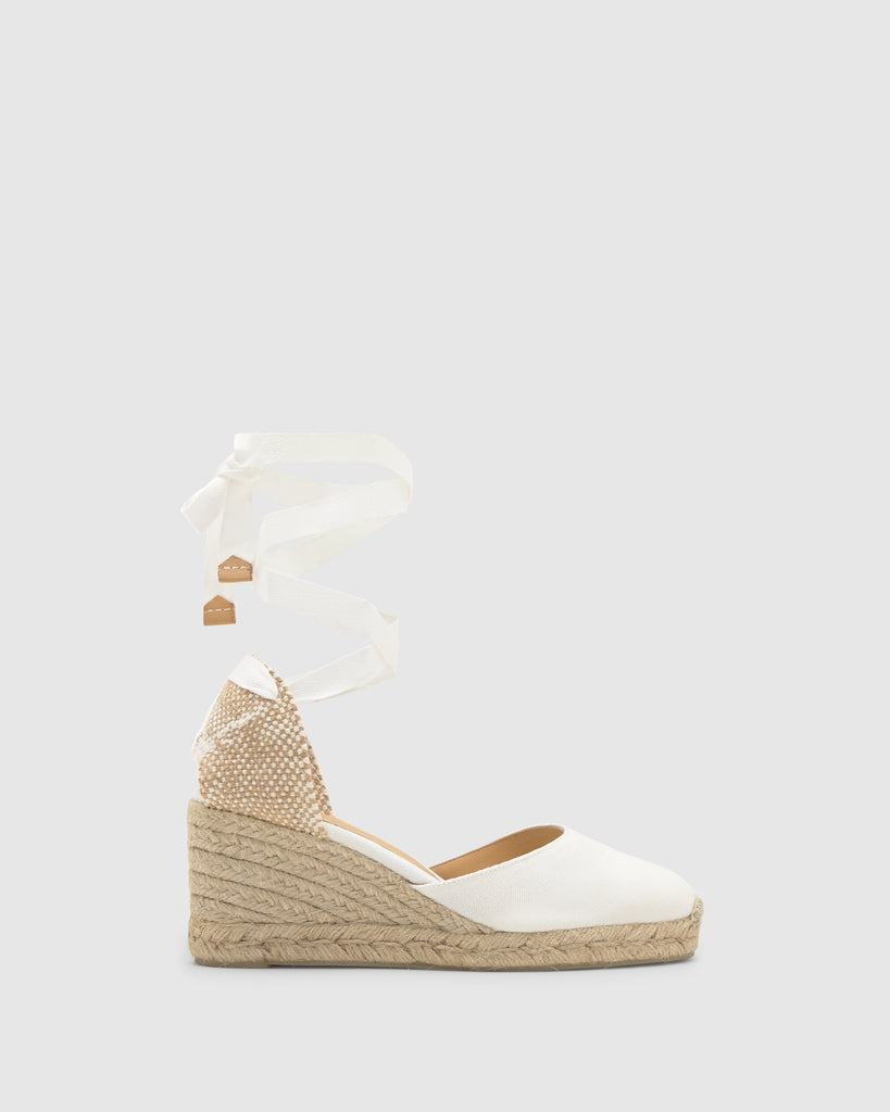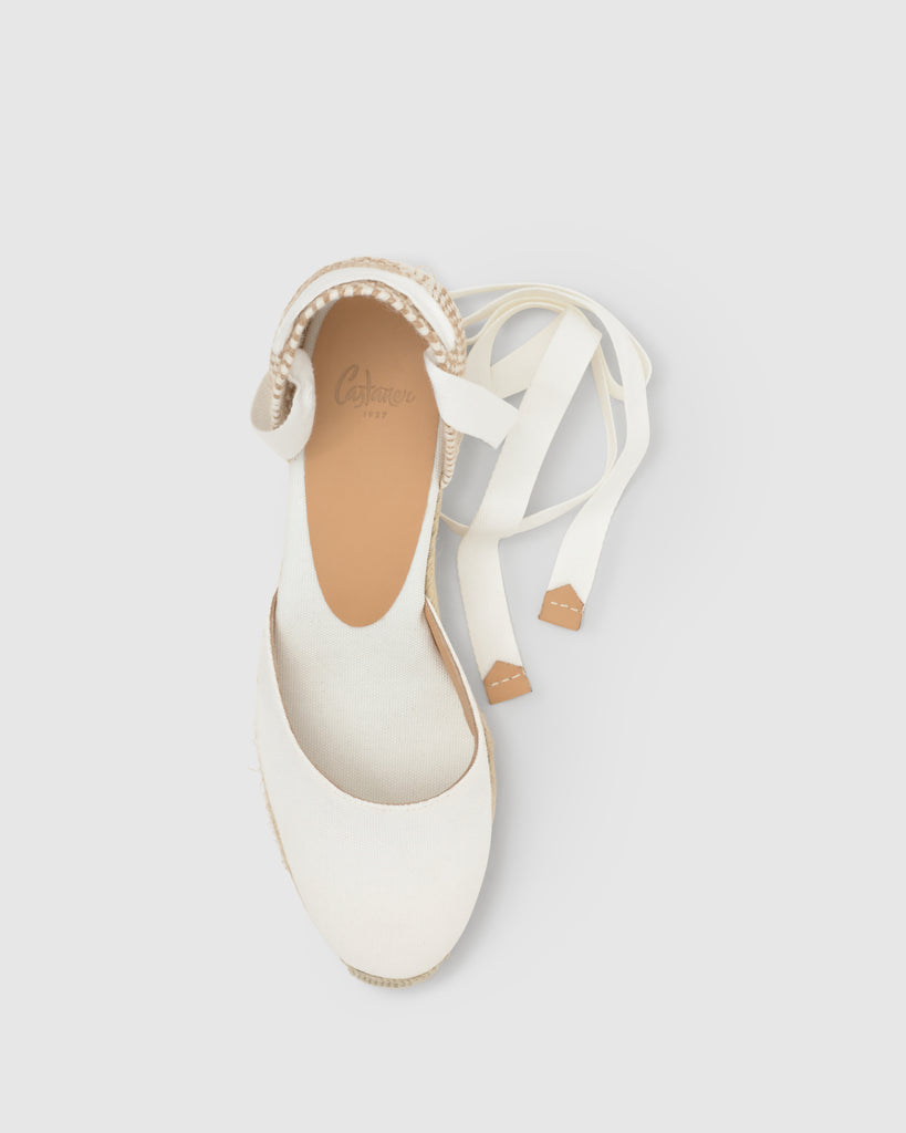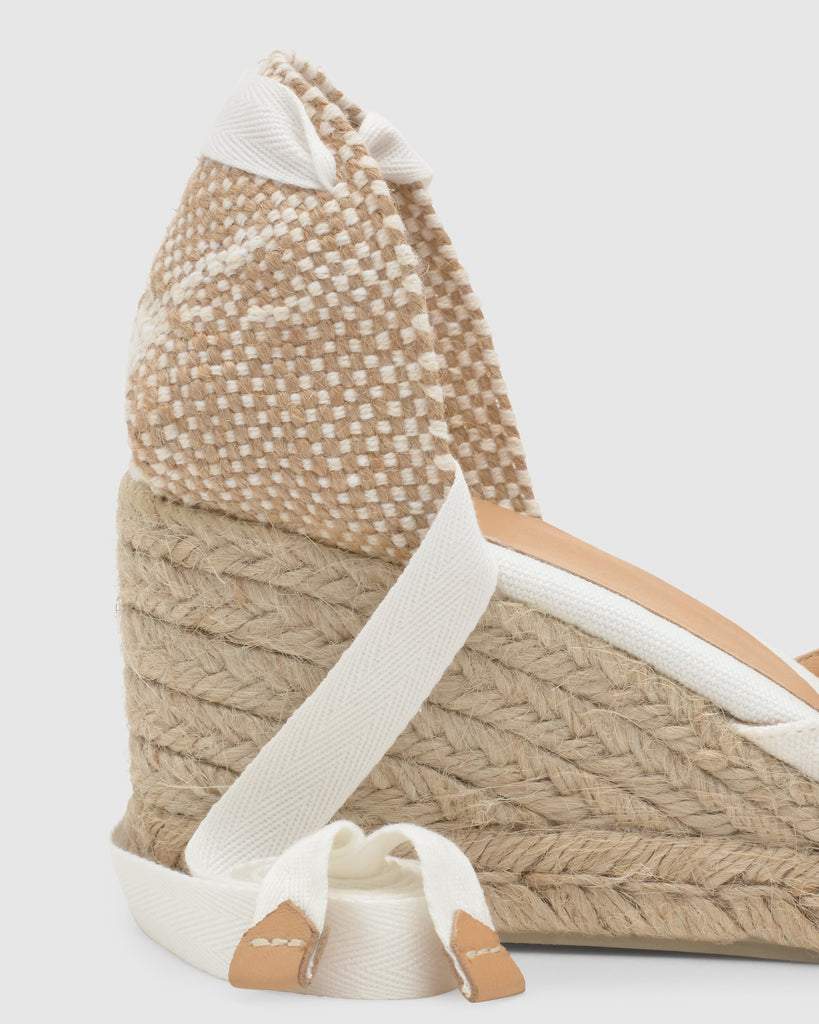 Icónica alpargata Carina en algodón orgánico con cierre de cintas, plantilla acolchada y cuña de yute de 7 cm.