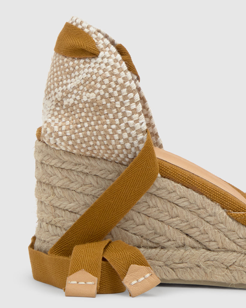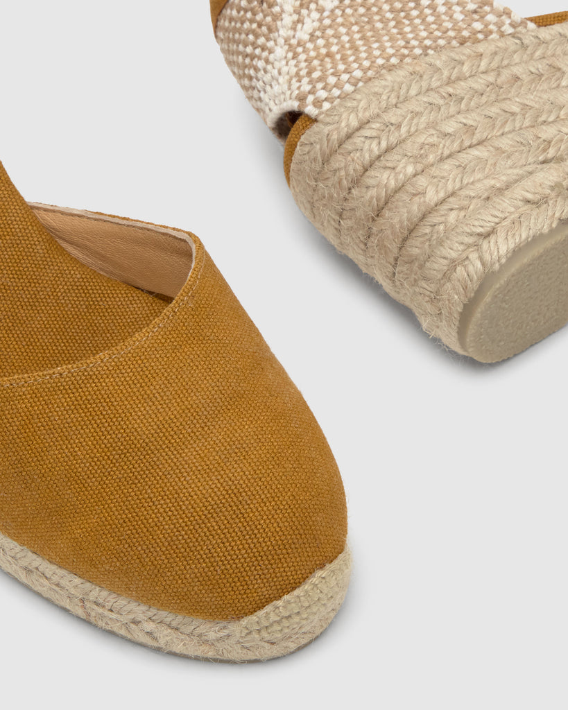 Icónica alpargata Carina en algodón orgánico lavado con cierre de cintas, plantilla acolchada y cuña de yute de 7 cm.