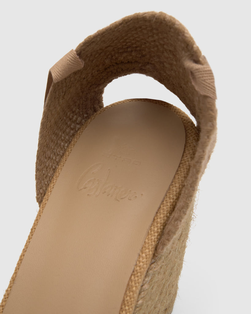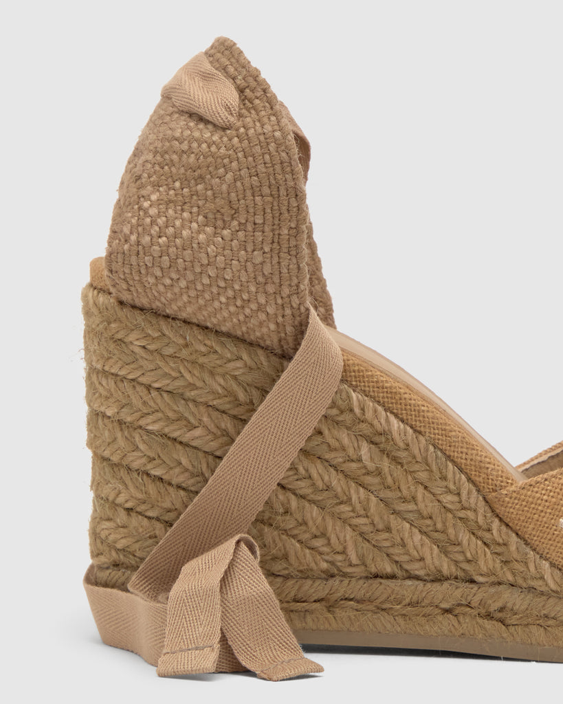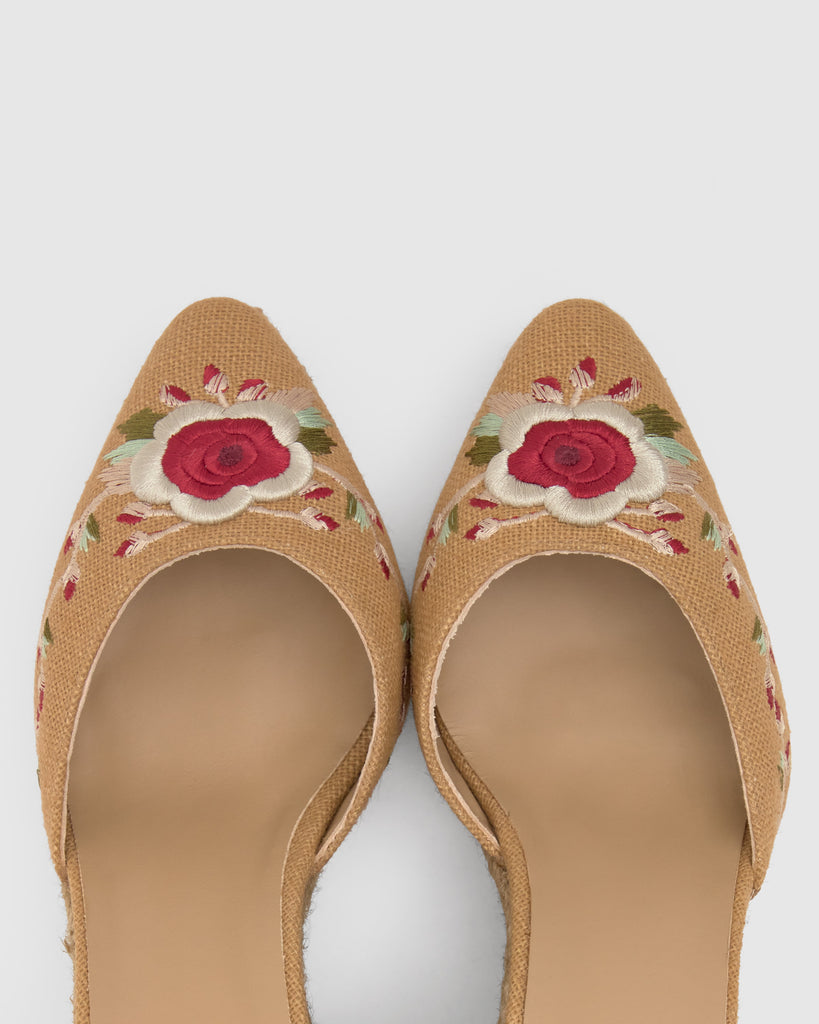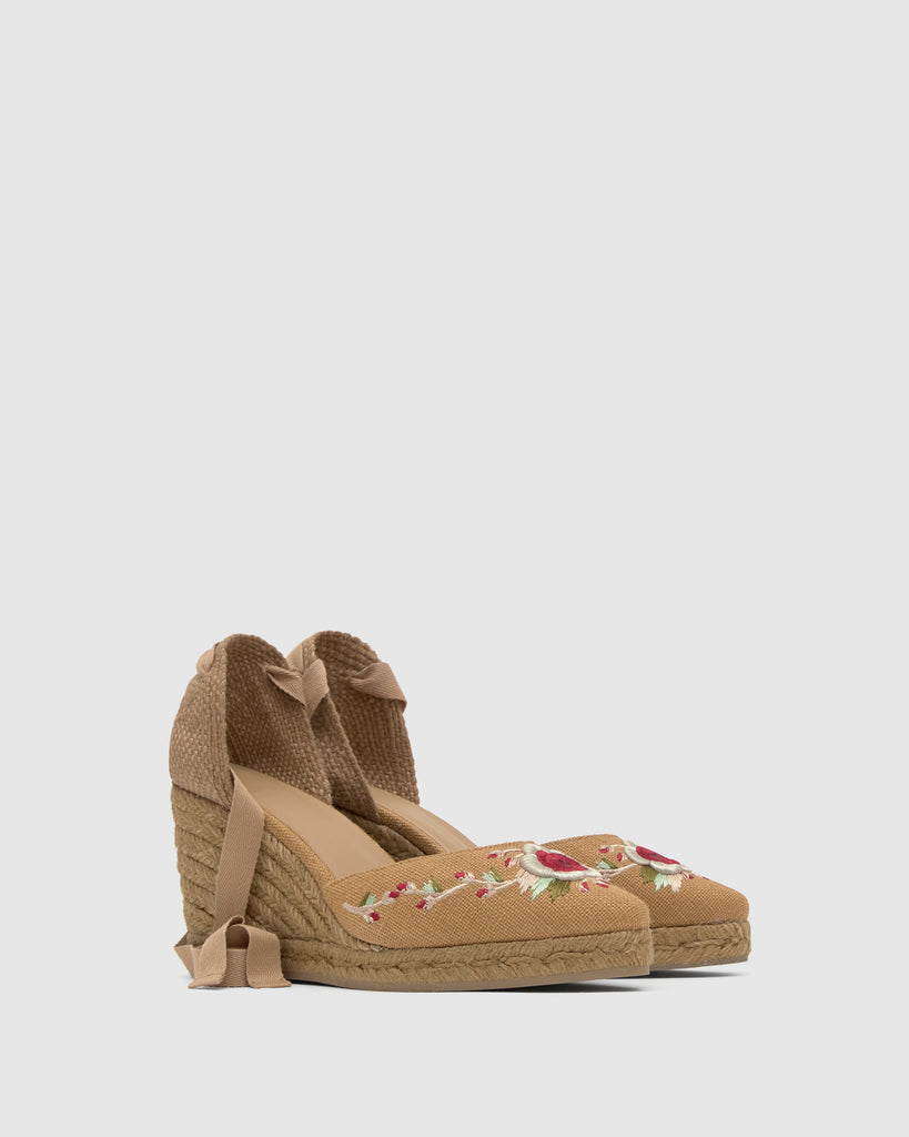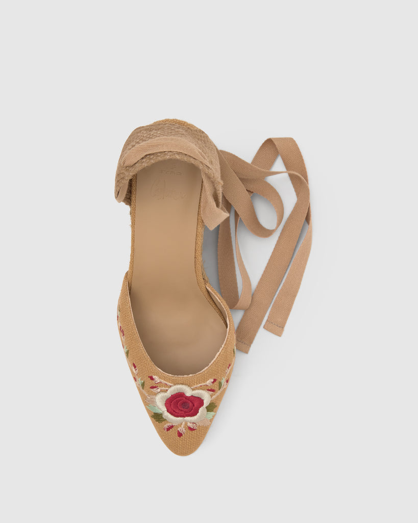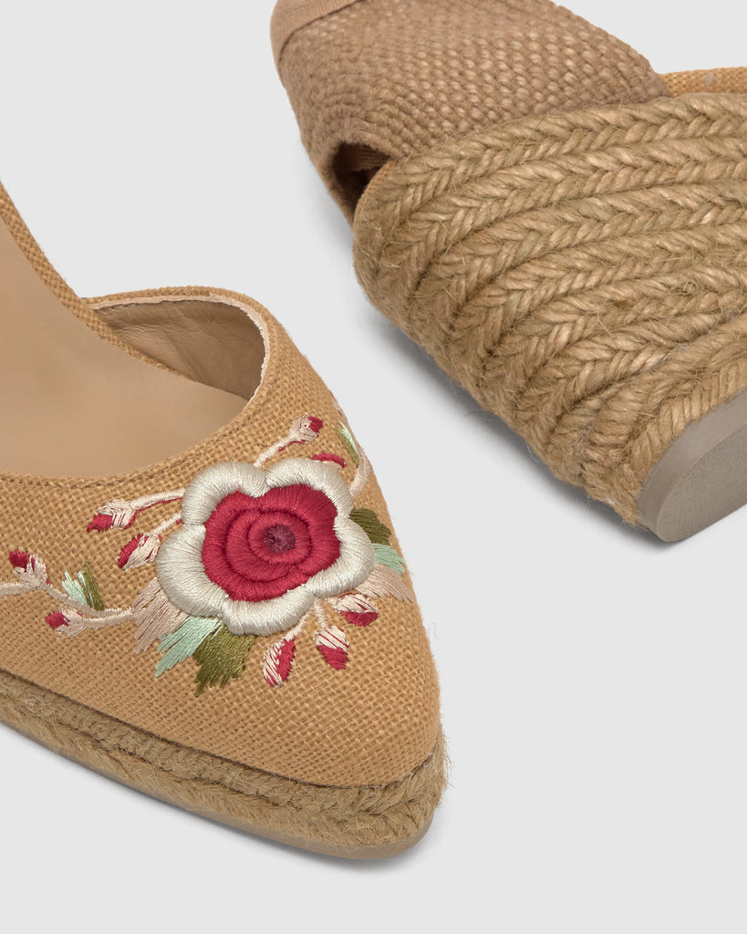 Icónica alpargata Joyce en lino con diseño floral bordado diseñado por ETRO. Cierre de cintas, punta afilada, plantilla acolchada y cuña de yute taupe de 9cm.