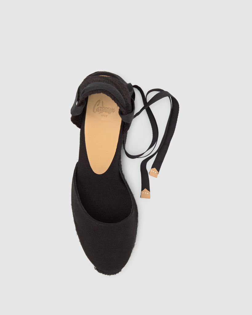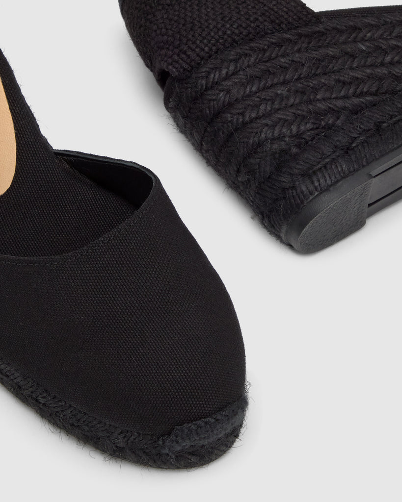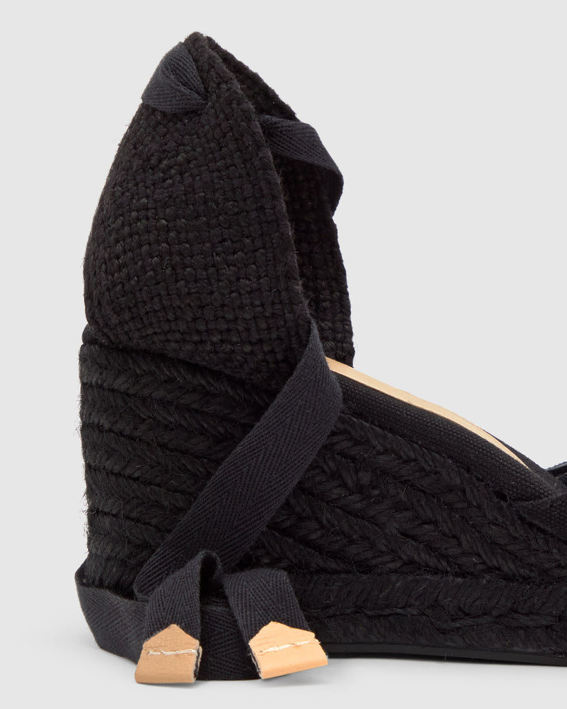 Icónica alpargata Carina en algodón orgánico con cierre de lazada, plantilla acolchada y cuña de yute tintado de 7 cm.