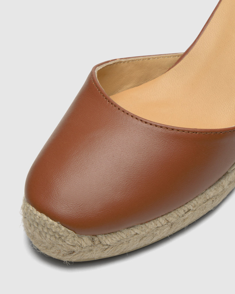 Icónica alpargata Carina en napa con cierre de lazo de cuero, plantilla acolchada y cuña de yute de 7 cm.