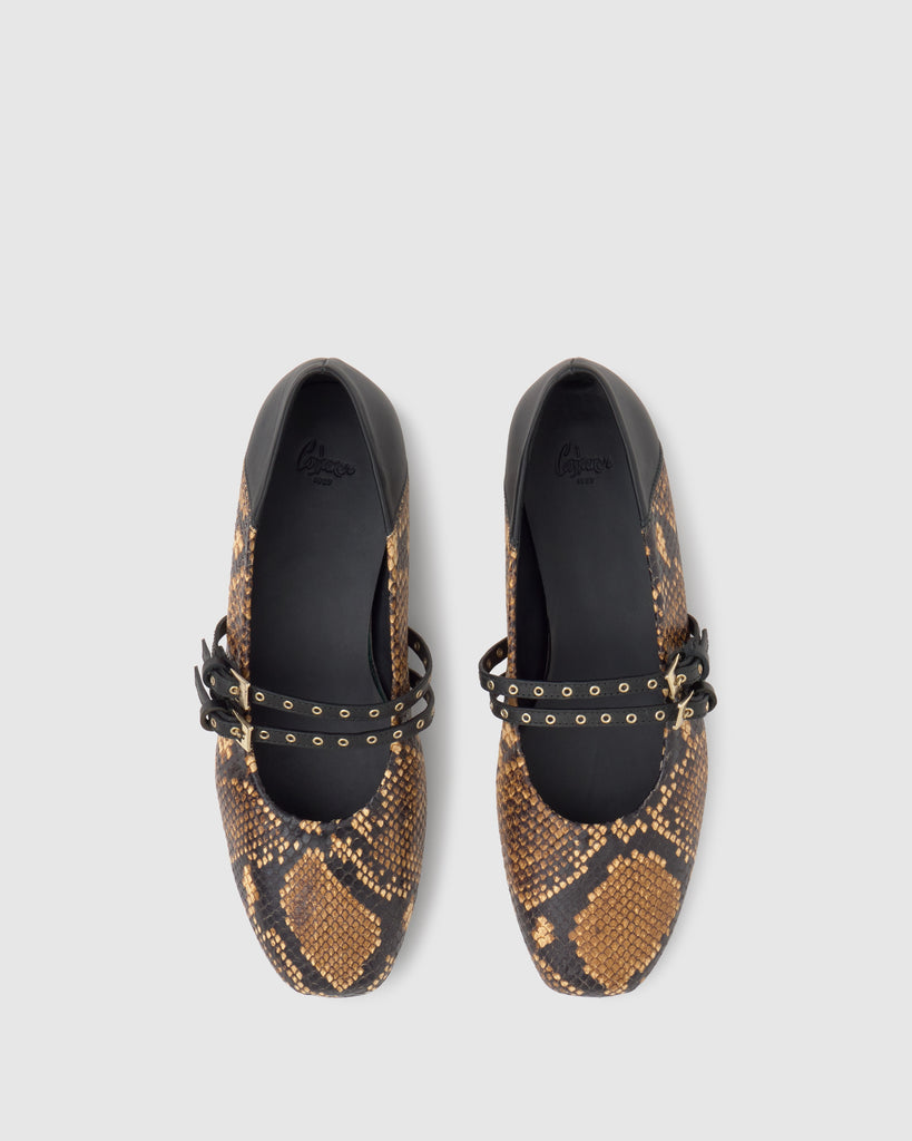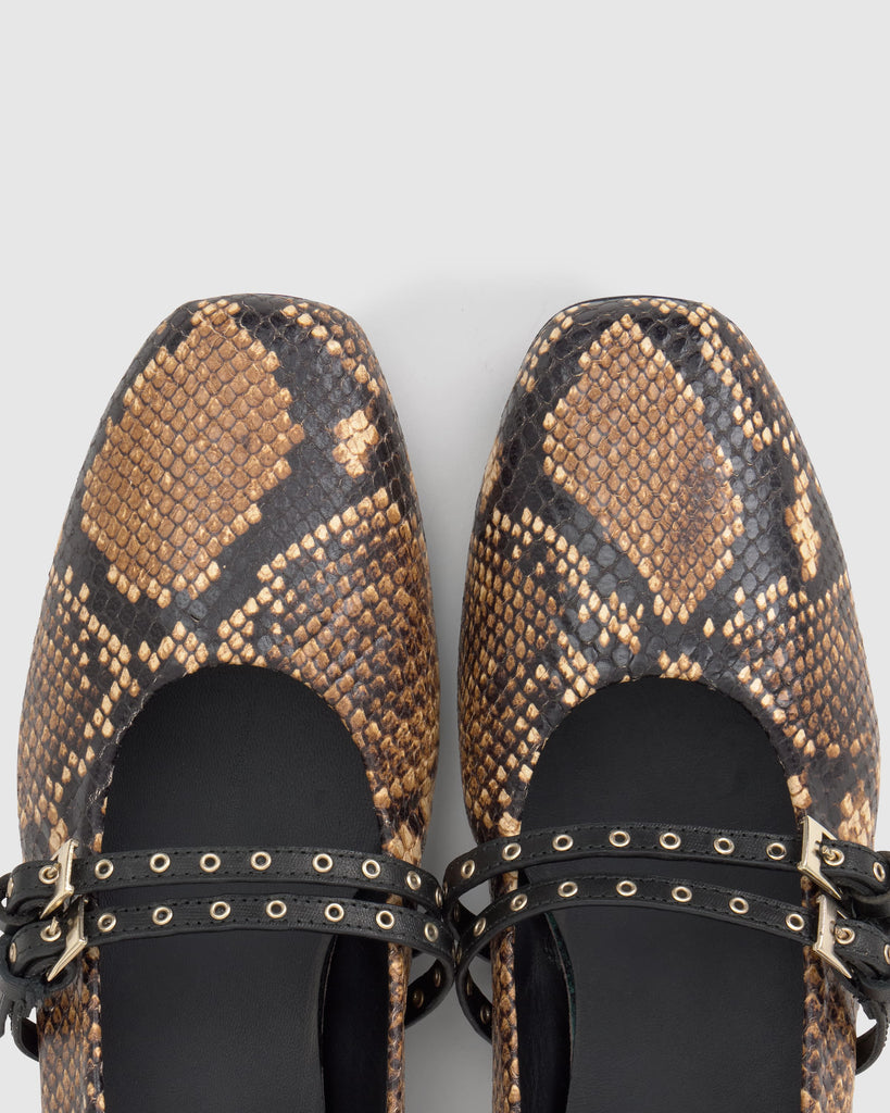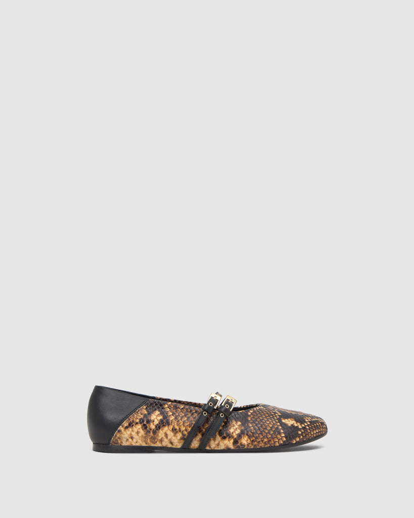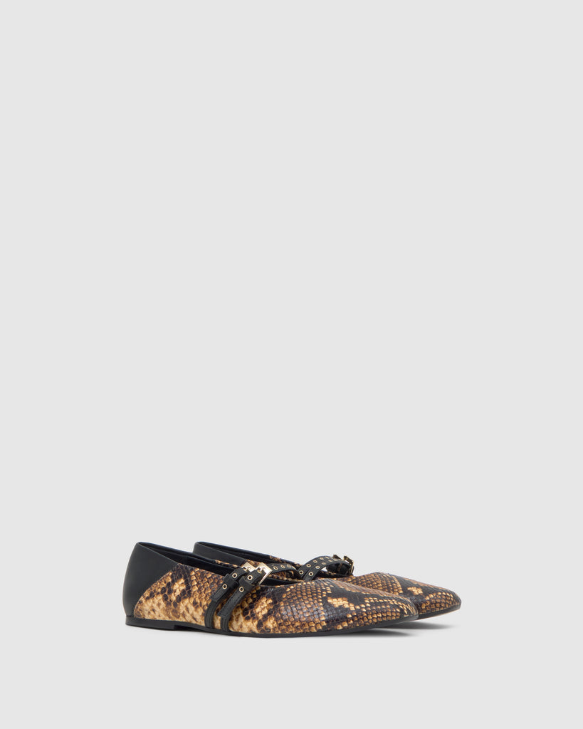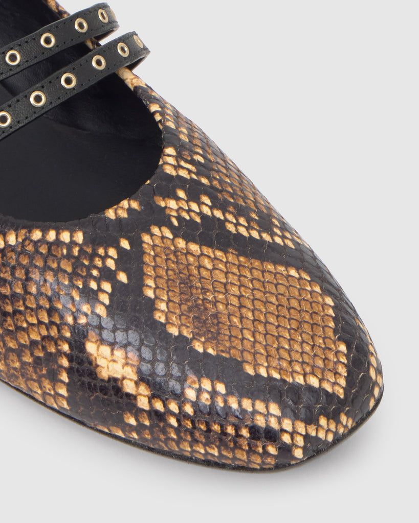 Bailarina plana Sabina en napa combinada: estampada efecto serpiente y lisa en contraste, doble pulsera de cuero, plantilla acolchada y suela de cuerolite.