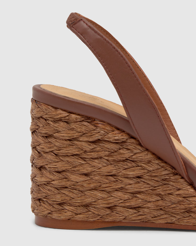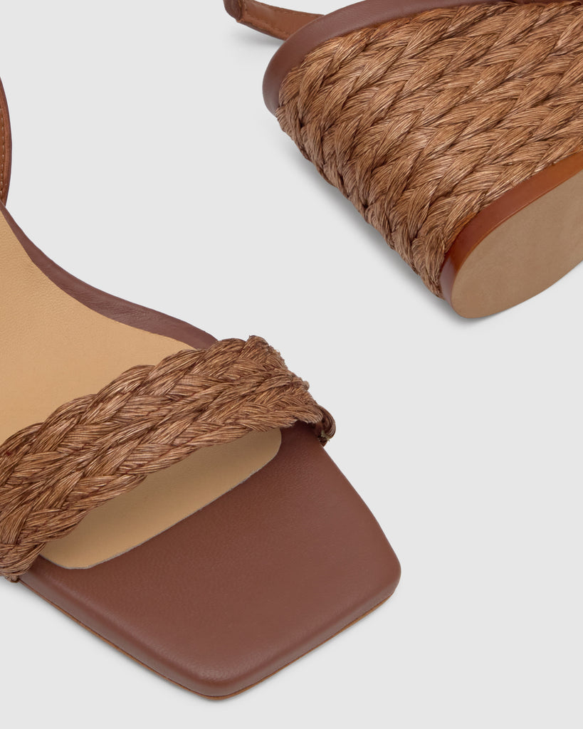 Sandalia Barby destalonada con trenzado artesanal en rafia natural. Plantilla acolchada y cuña de 8cm forrada a juego.