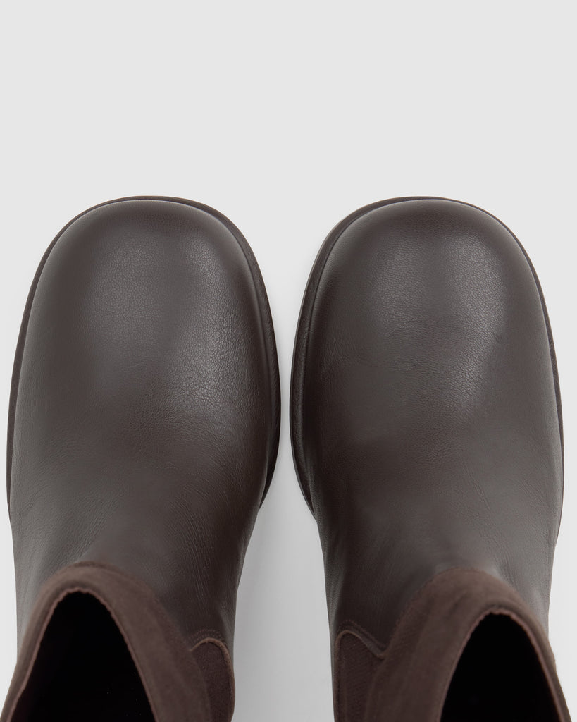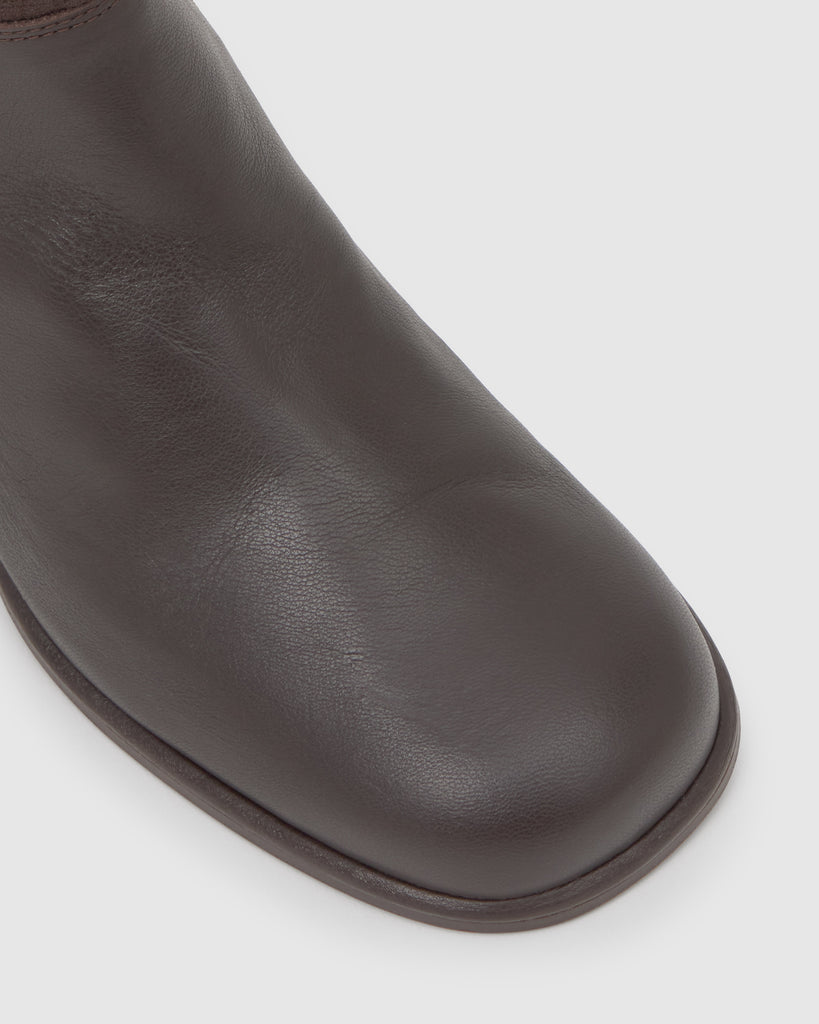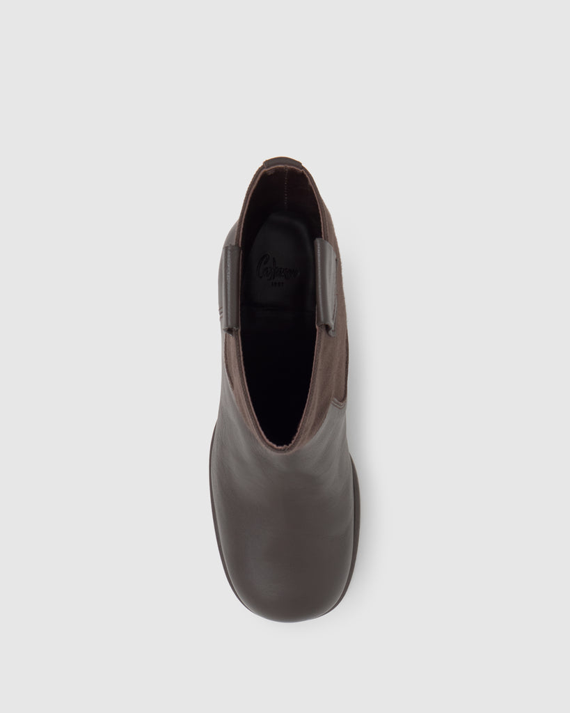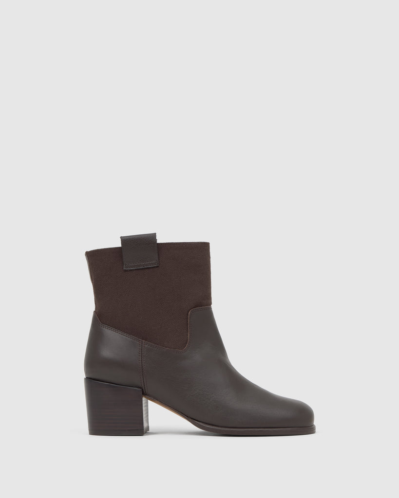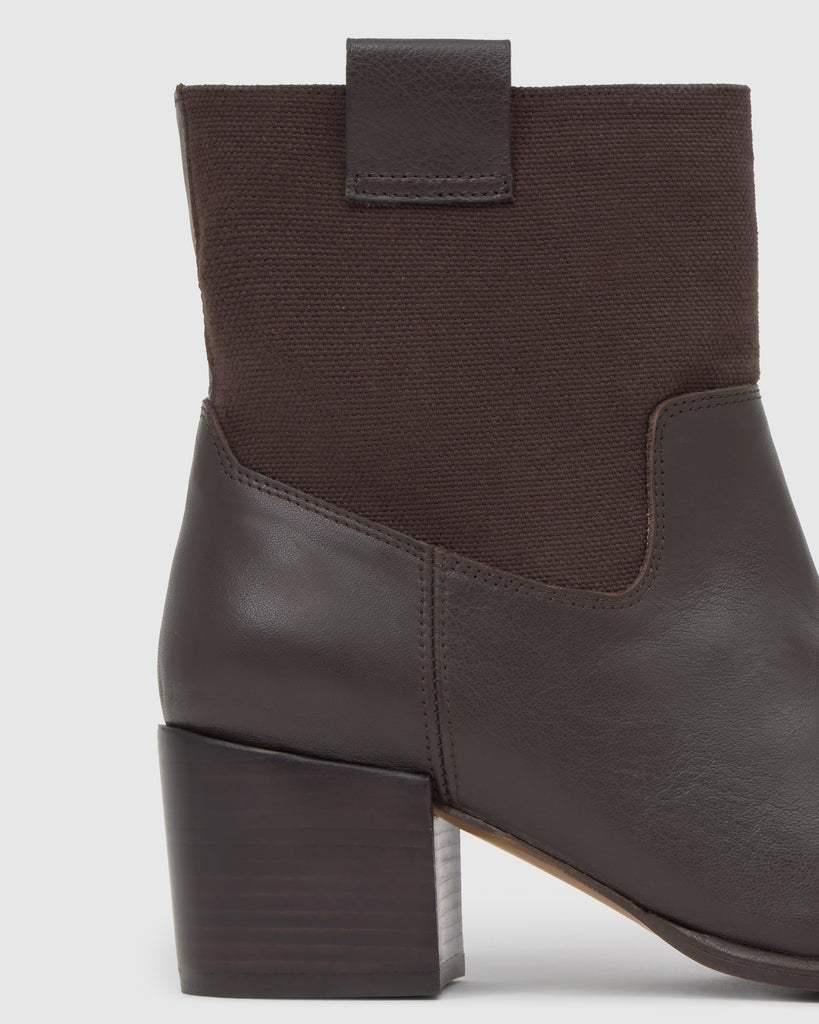 Botín Nona en napa combinada con caña en lona de algodón orgánico, plantilla acolchada y tacón de 6cm con acabado madera.