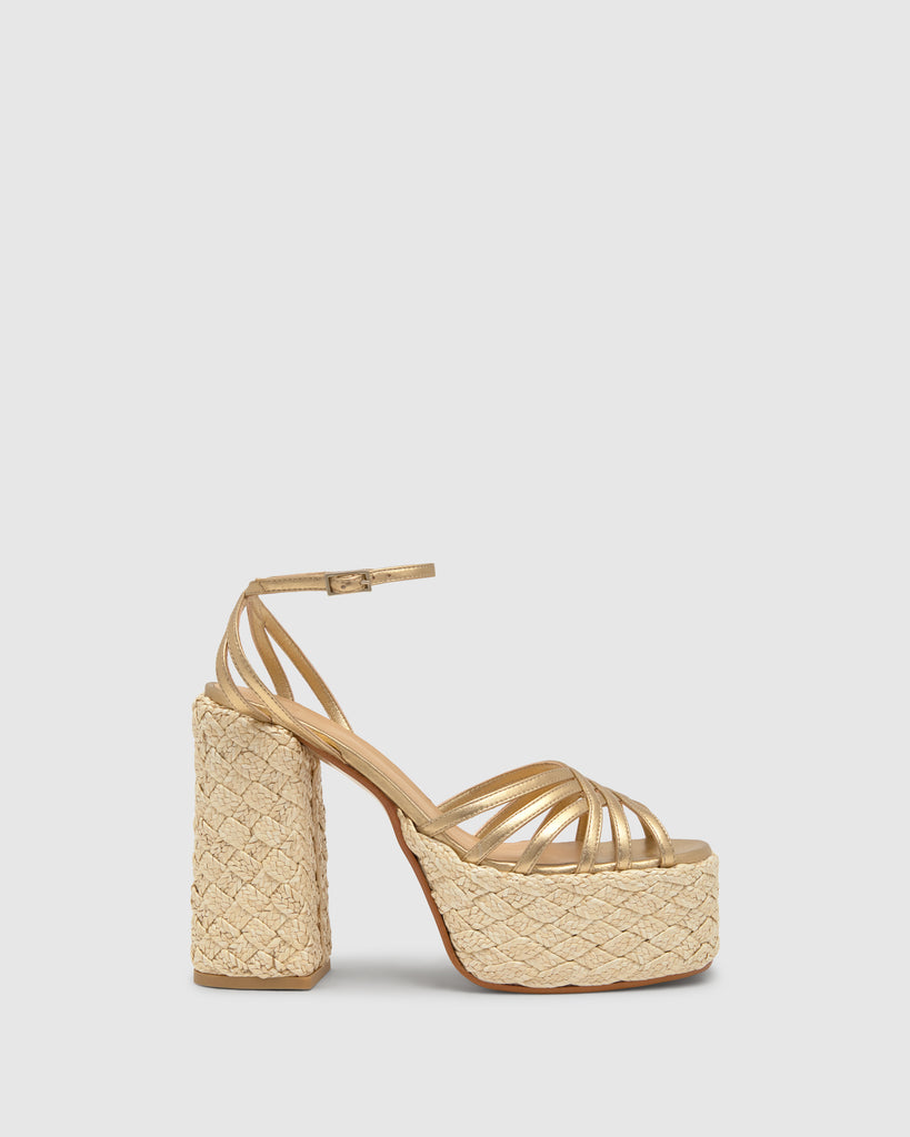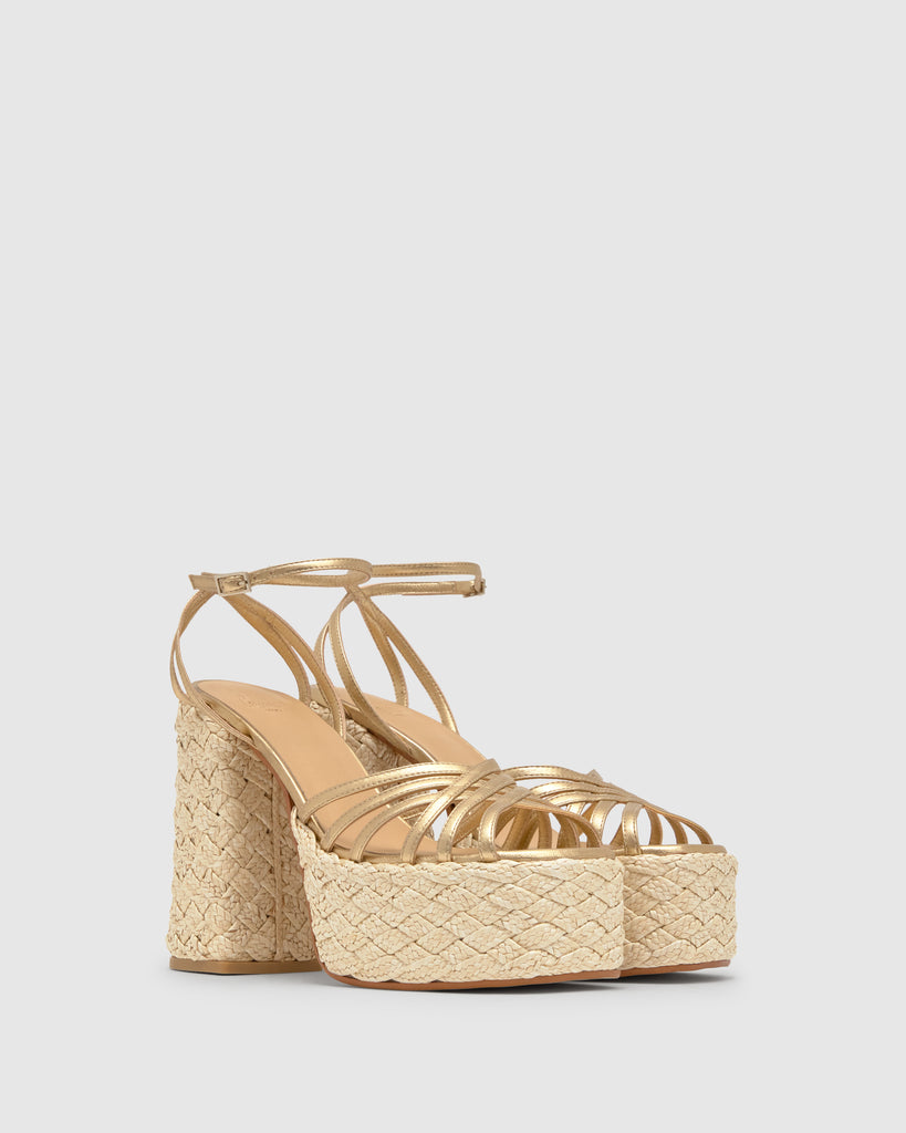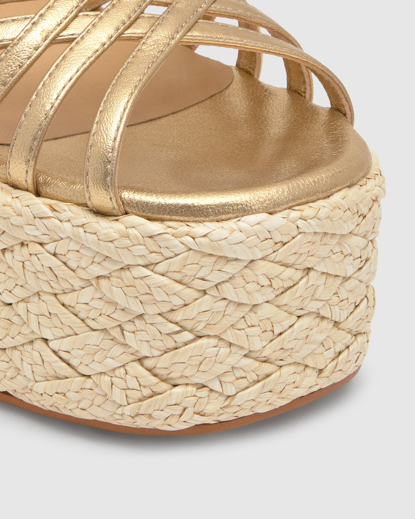 Sandalia Farah con finas tiras en piel metalizada, cierre de pulsera y plantilla acolchada. Tacón de 13 cm y plataforma forrados en rafia trenzada artesanalmente.