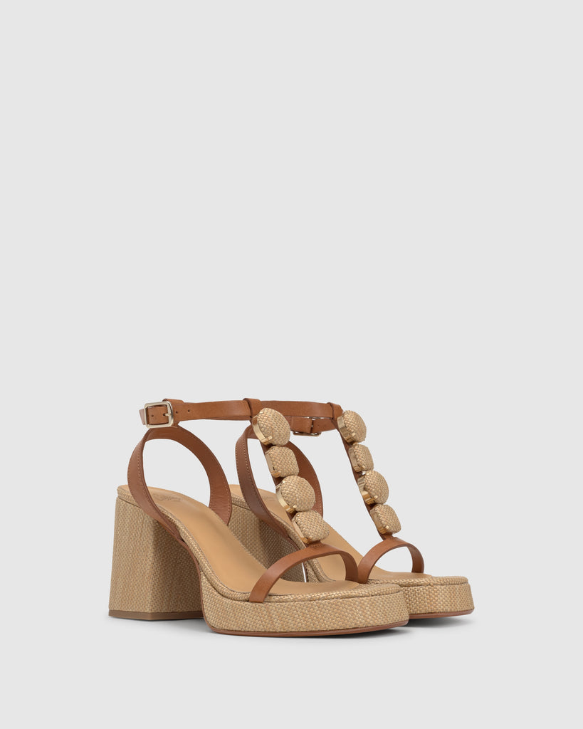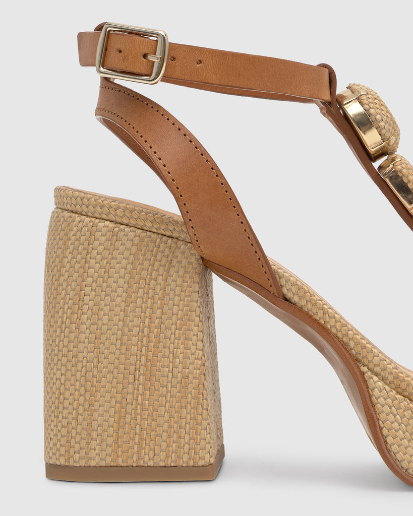 Sandalia Vitto en napa con adornos forrados en rafia, cierre de pulsera, plantilla acolchada y tacón de 10cm.
