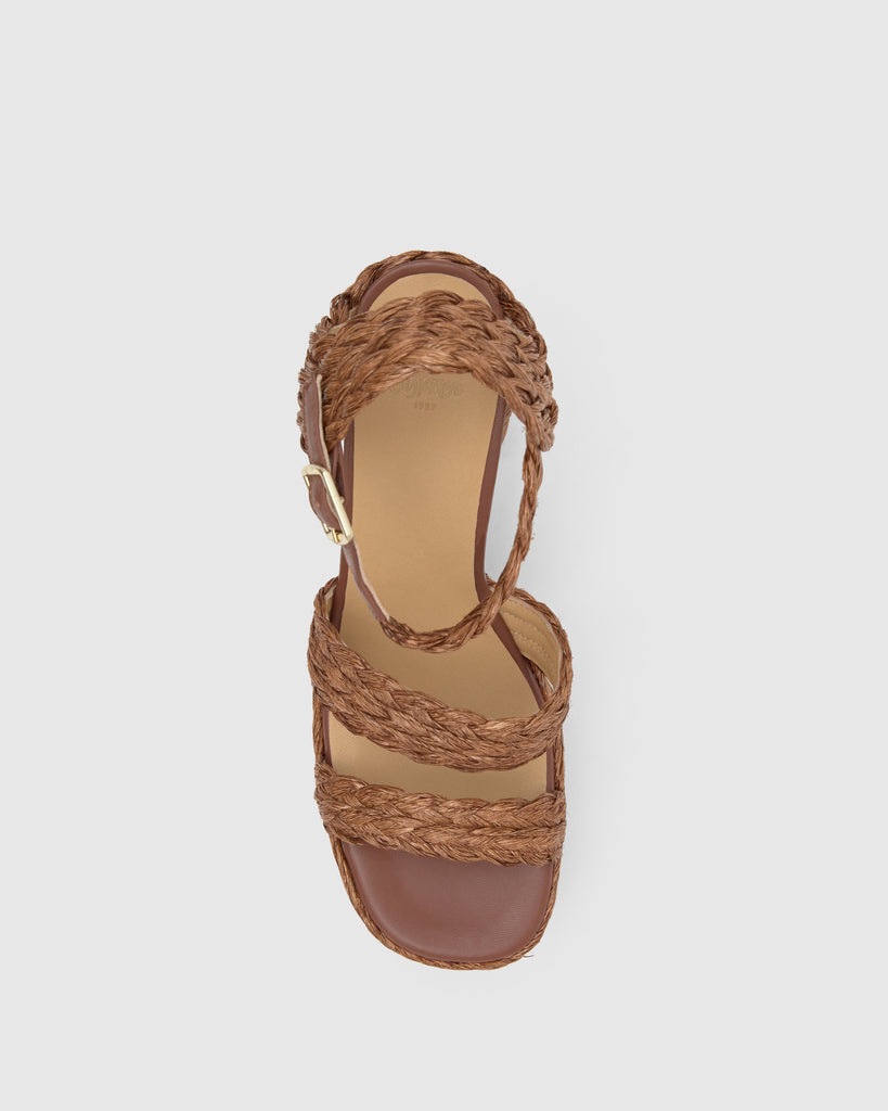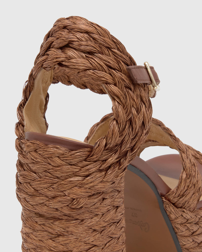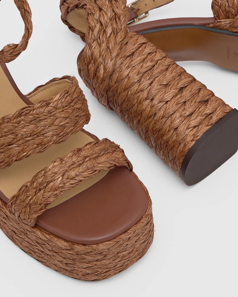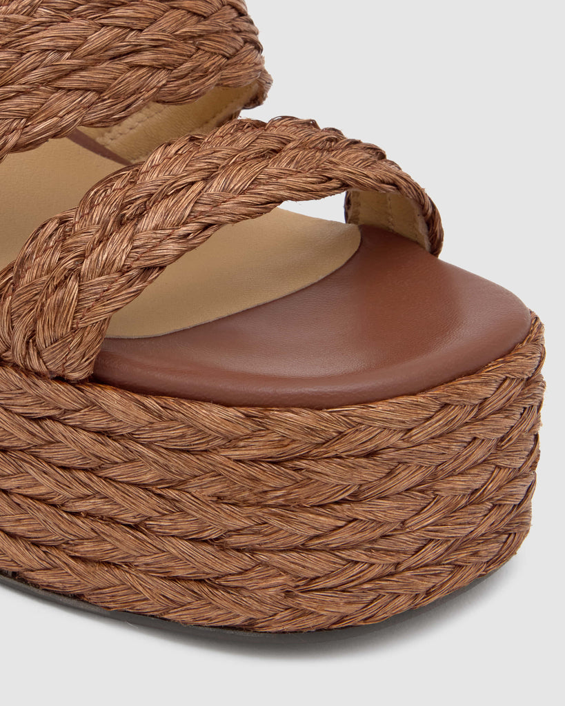 Sandalia Fresa en rafia tintada con cierre de pulsera y plantilla acolchada. Tacón de 13 cm y plataforma forrados a juego.