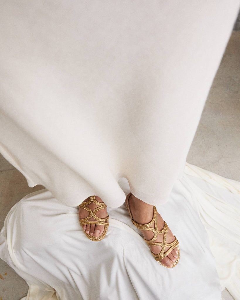 Pitra flat sandal with handmade metallic braiding, buckle closure and jute insole with leather sole.