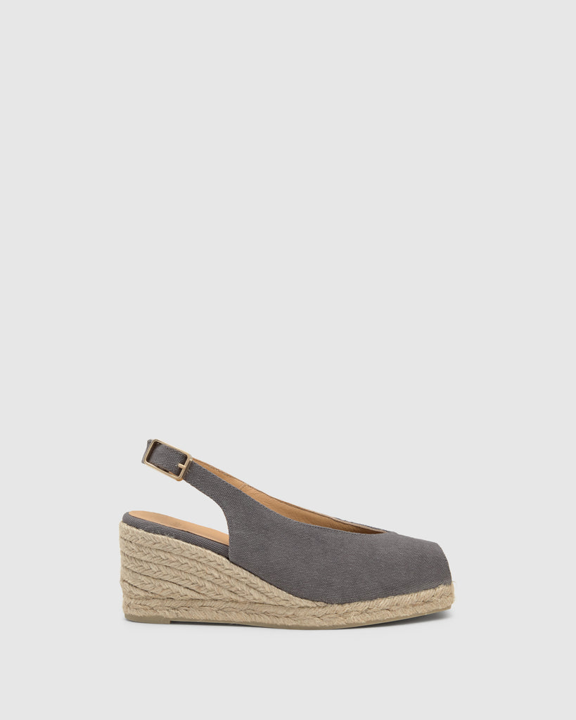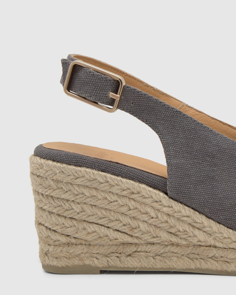 Dosalia peep-toe espadrilles in washed organic cotton with adjustable buckle and cushioned insole. Jute wedge of 7cm.