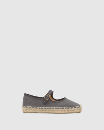 Padua mary-jane style flat espadrille in washed organic cotton with buckle closure and jute sole.