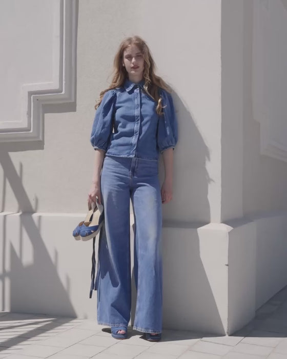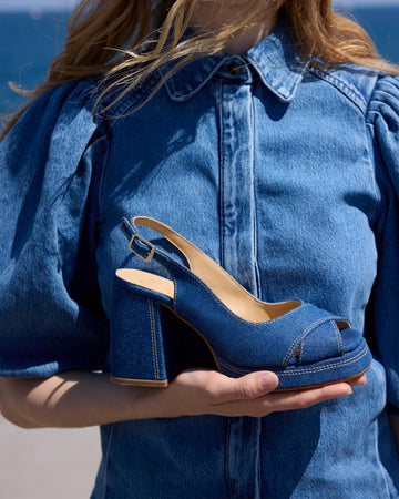 Vania peep-toe style sandal in denim with buckle closure, padded insole and open toe with 10 cm heel and platform covered to match.