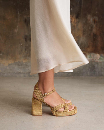 Icónica sandalia Valle con trenzado metalizado artesanal, cierre de pulsera, plantilla acolchada y escote en V. Tacón de 10 cm forrado a juego.