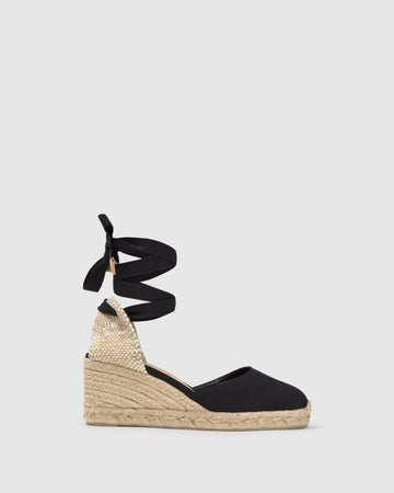 Iconique espadrille Carina en coton organique avec fermeture à lanières, semelle intérieure matelassée et talon compensé en jute de 7 cm.
