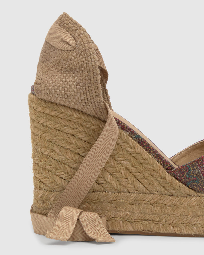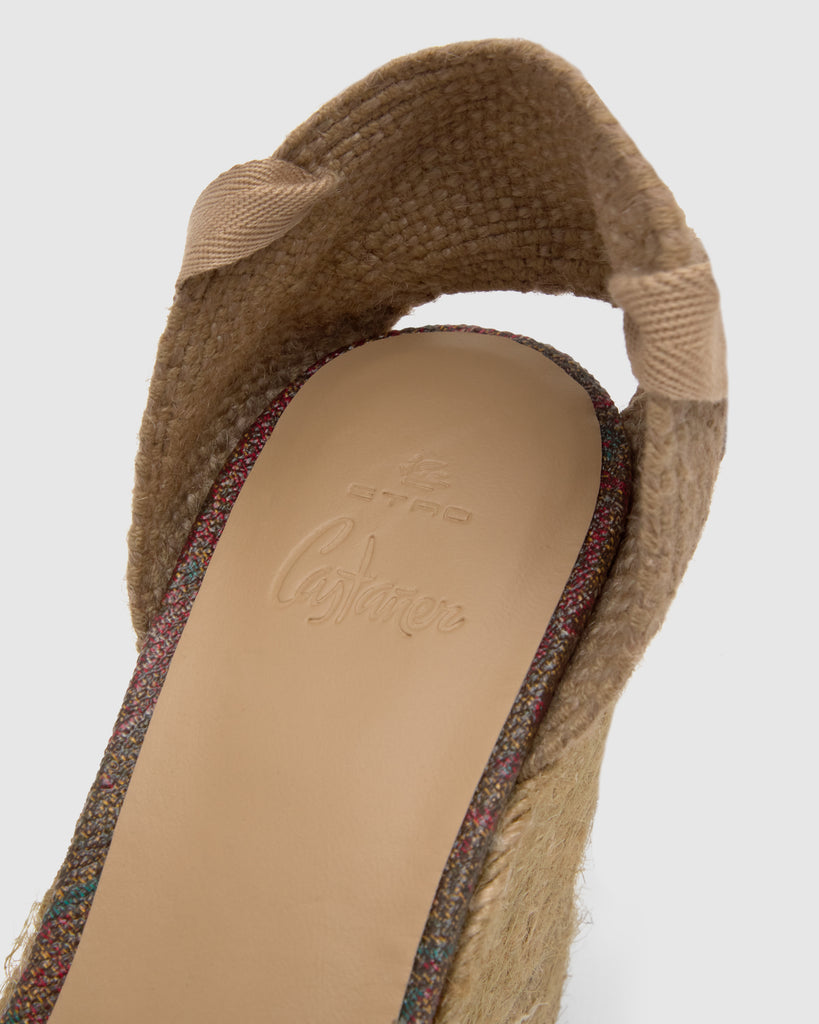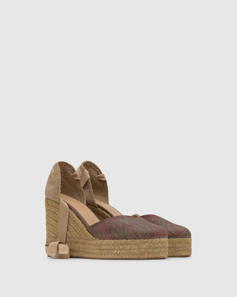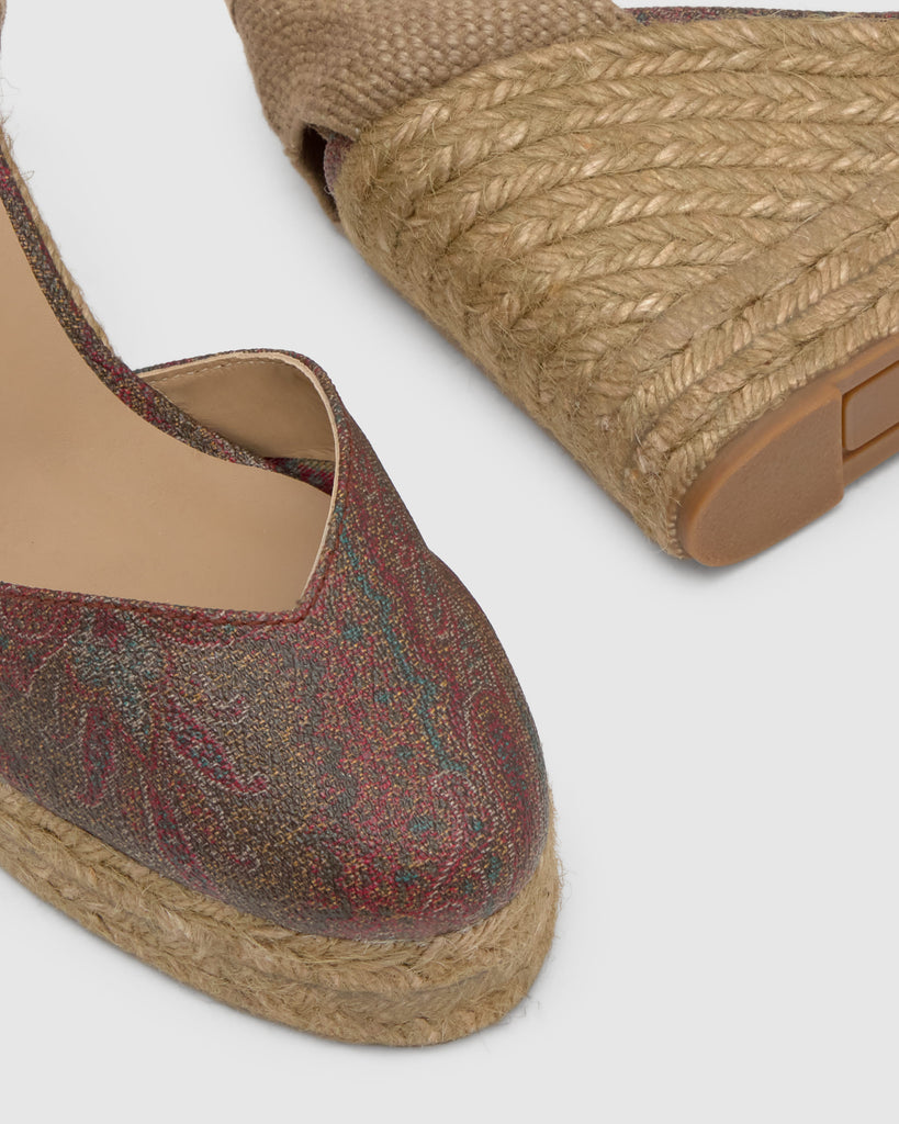 Espadrille Chiara réalisée avec le tissu jacquard emblématique d'ETRO avec finition caoutchoutée. Fermeture à lanières, semelle intérieure matelassée et décolleté en V. Talon compensé en jute taupe de 11 cm à double plateforme, caractéristique de Castañer.