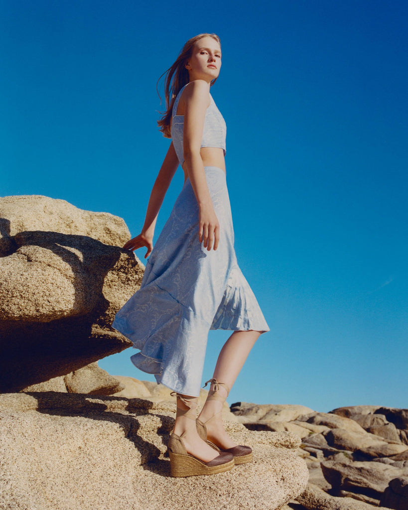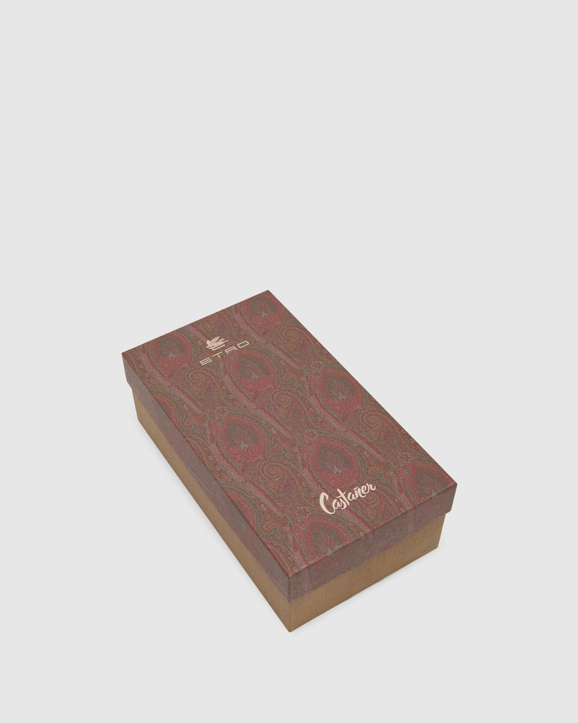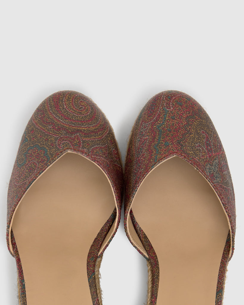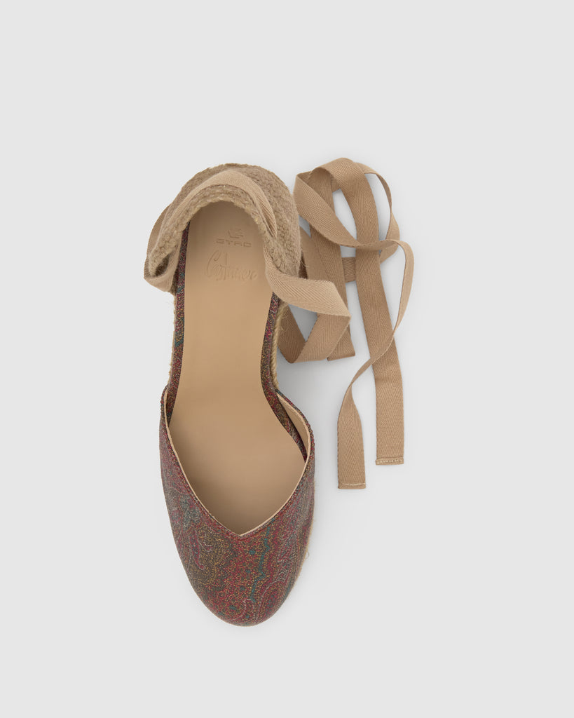 Espadrille Chiara réalisée avec le tissu jacquard emblématique d'ETRO avec finition caoutchoutée. Fermeture à lanières, semelle intérieure matelassée et décolleté en V. Talon compensé en jute taupe de 11 cm à double plateforme, caractéristique de Castañer.