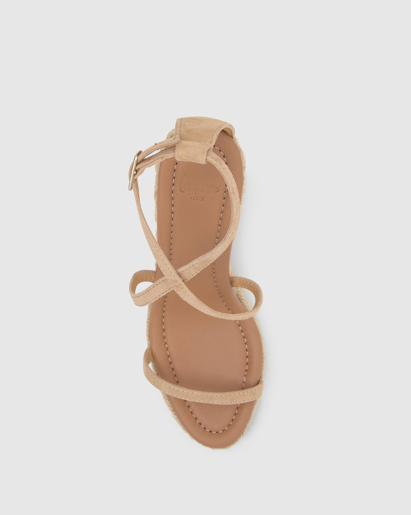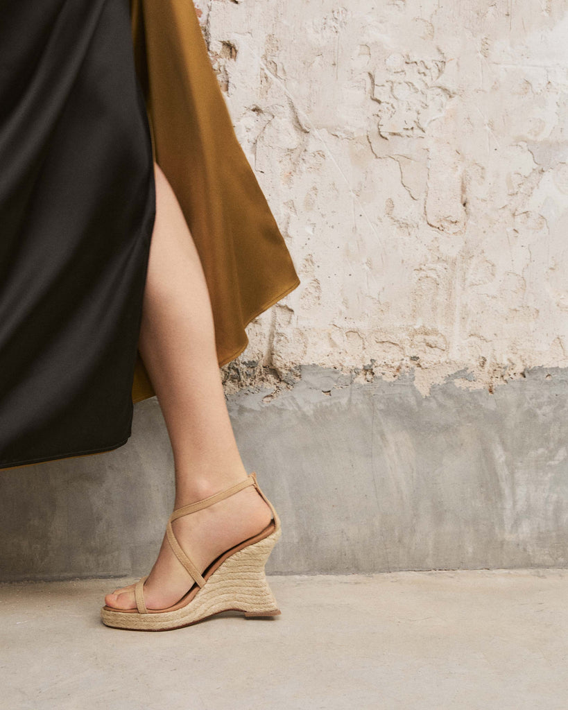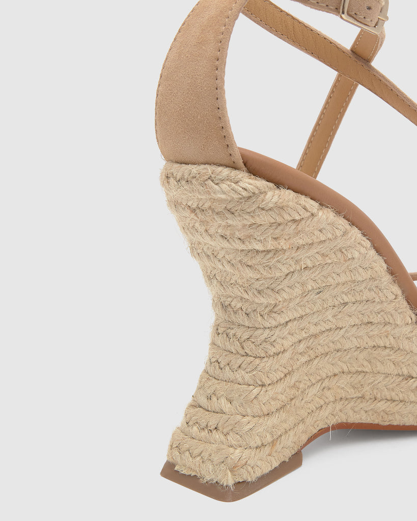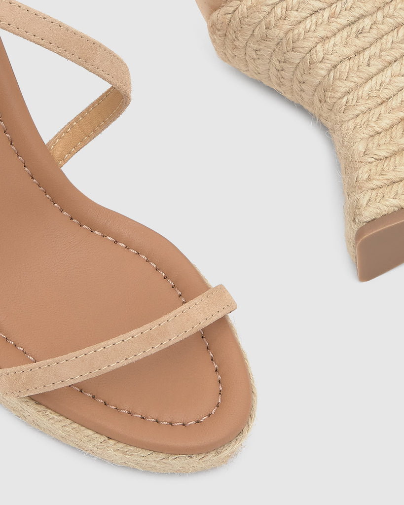 Sandalo Joana in suede con chiusura a cinturino, soletta imbottita e zeppa in juta di 11 cm.