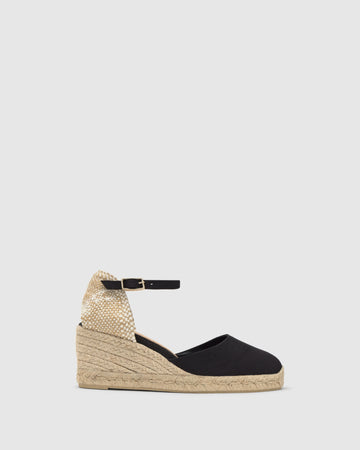 Iconica espadrilla Carol in cotone organico con chiusura a cinturino, soletta imbottita e zeppa in juta di 7 cm.