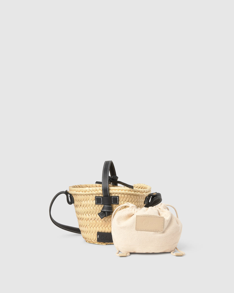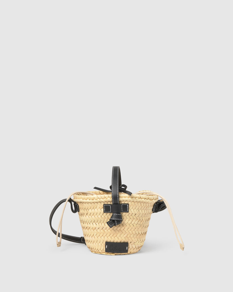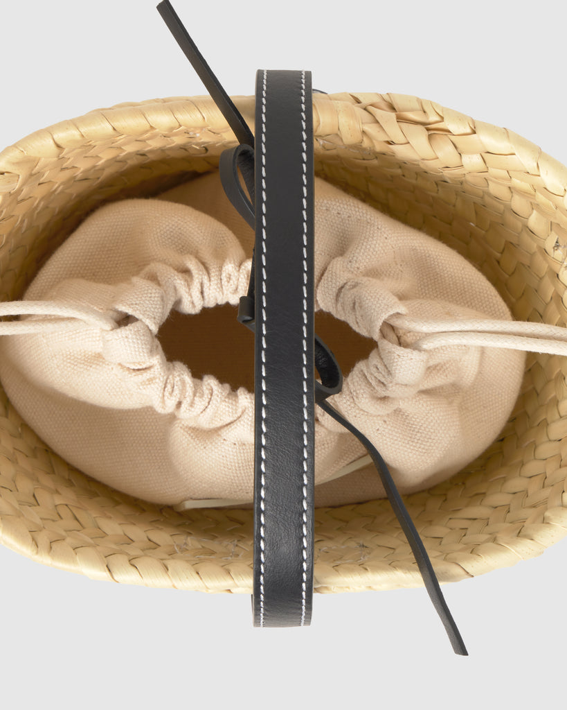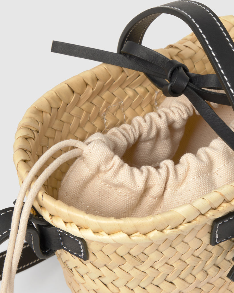 Mini capazo Tino en rafia natural con asas y acabados en cuero. Bolsa interior extraíble y cierre de lazo.