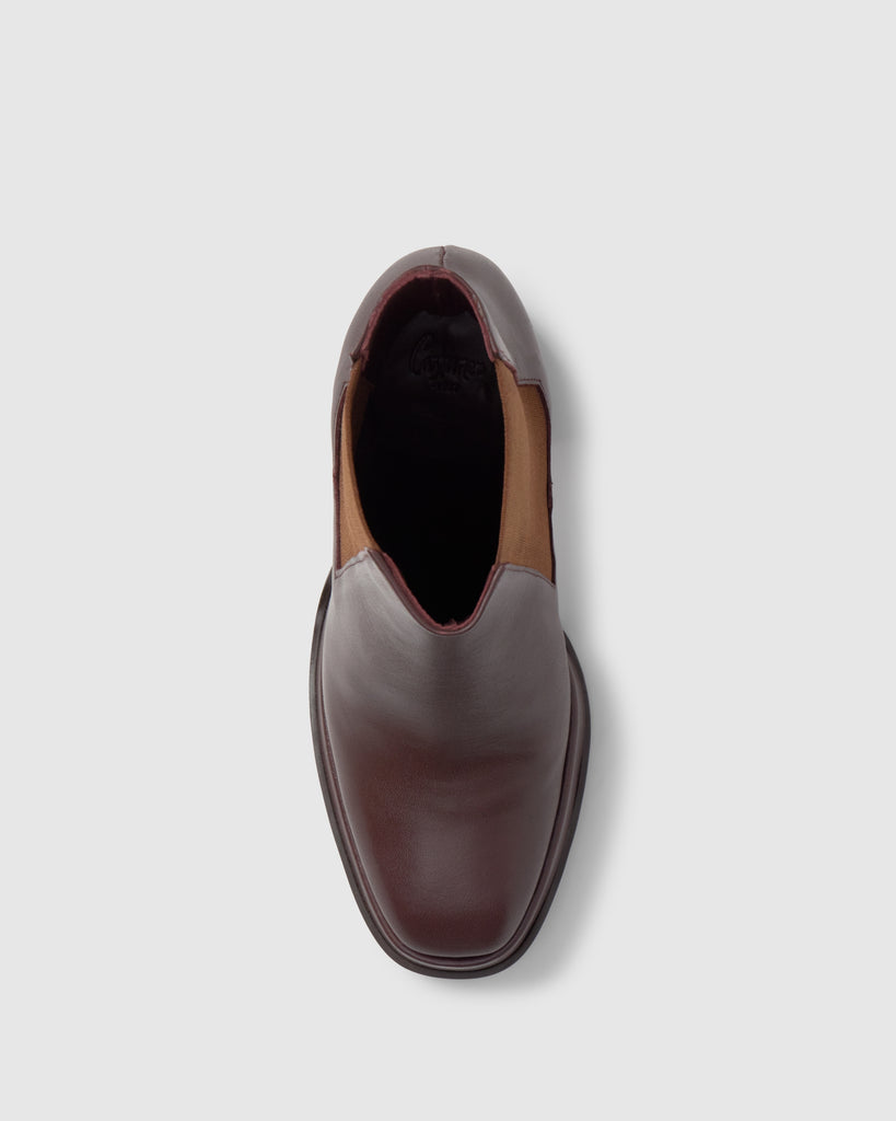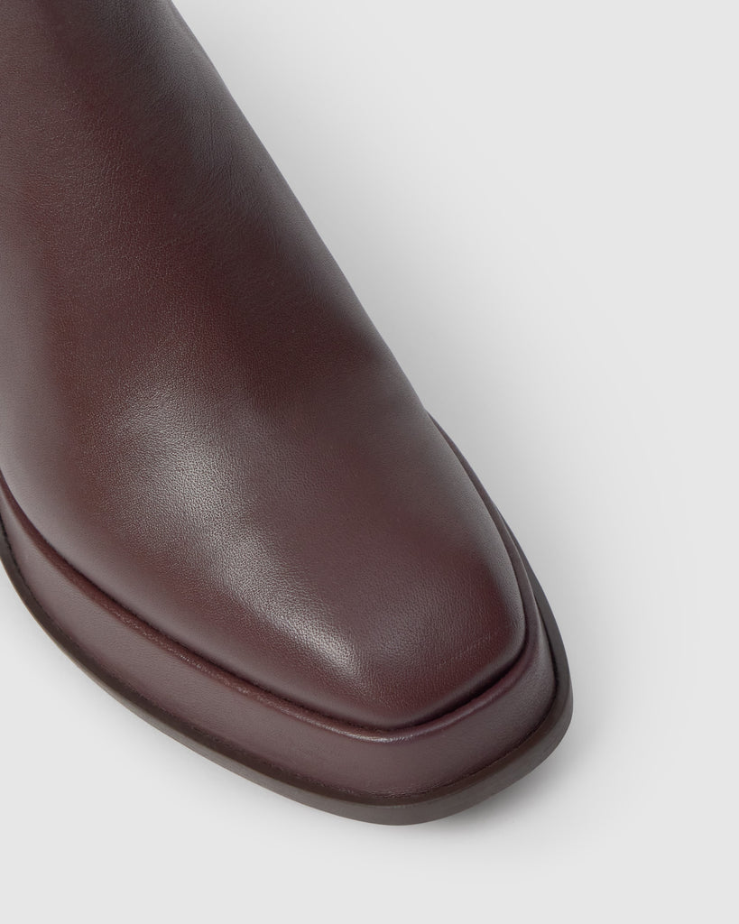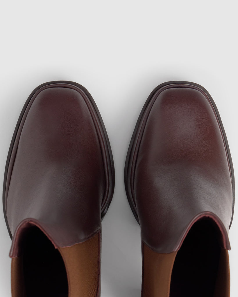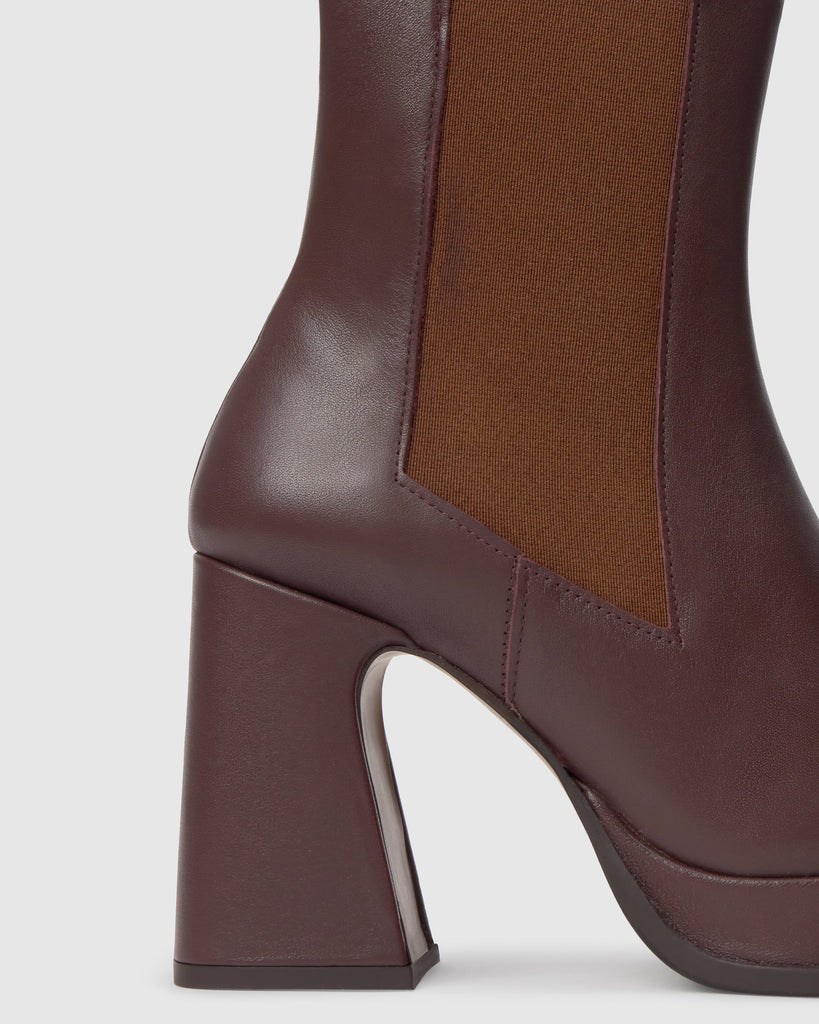 Botín Bimba en napa con cierre elástico, plantilla acolchada y tacón geométrico de 10cm forrado a juego.