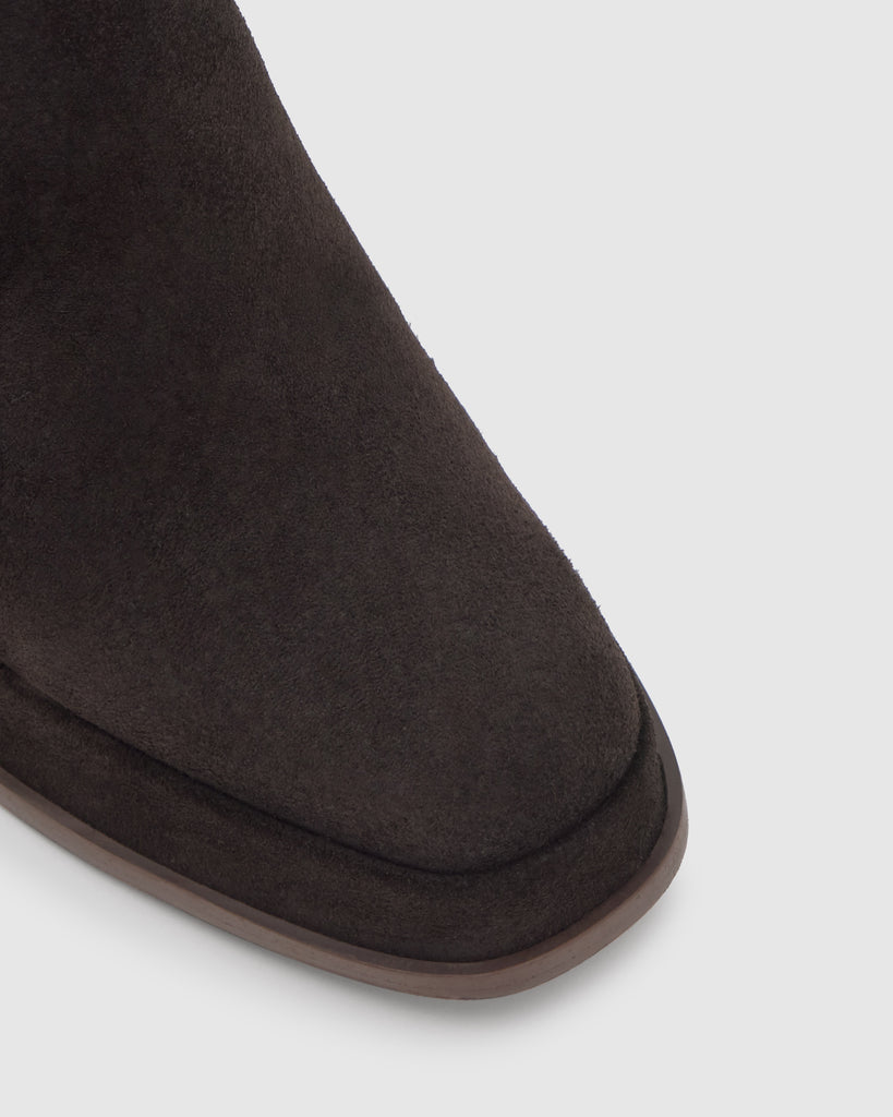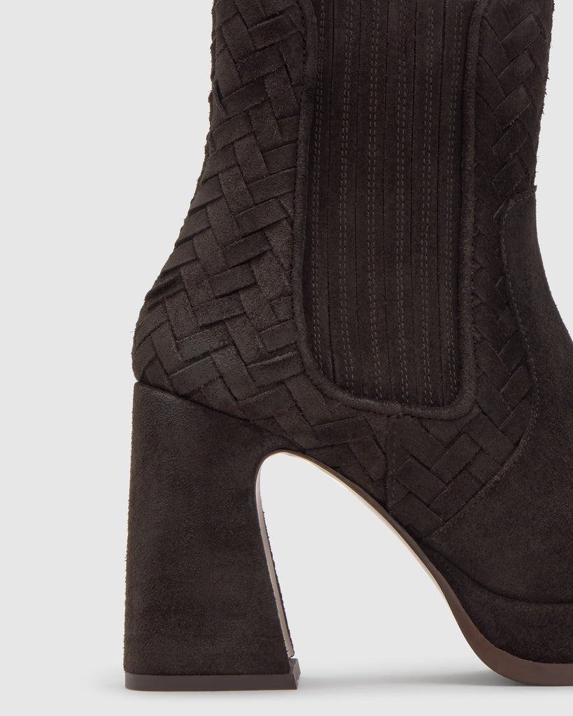 Botín Blanche en serraje con detalle intrecciato en la caña, cierre elástico, plantilla acolchada y tacón geométrico de 10cm forrado a juego.