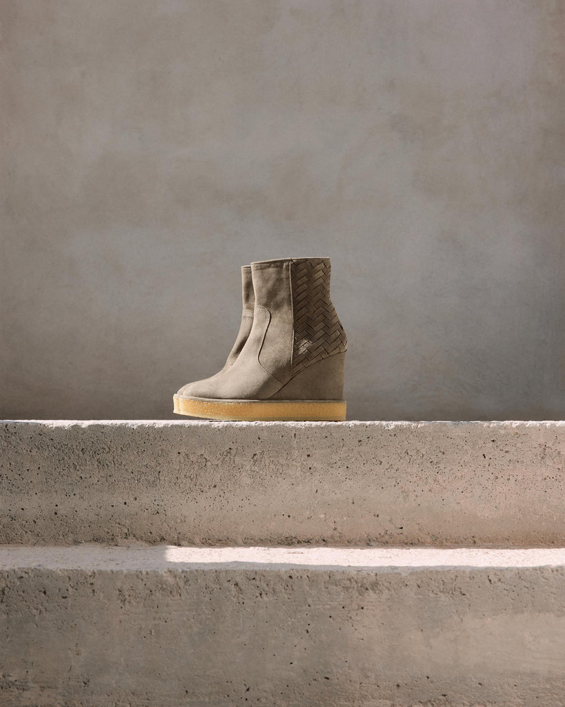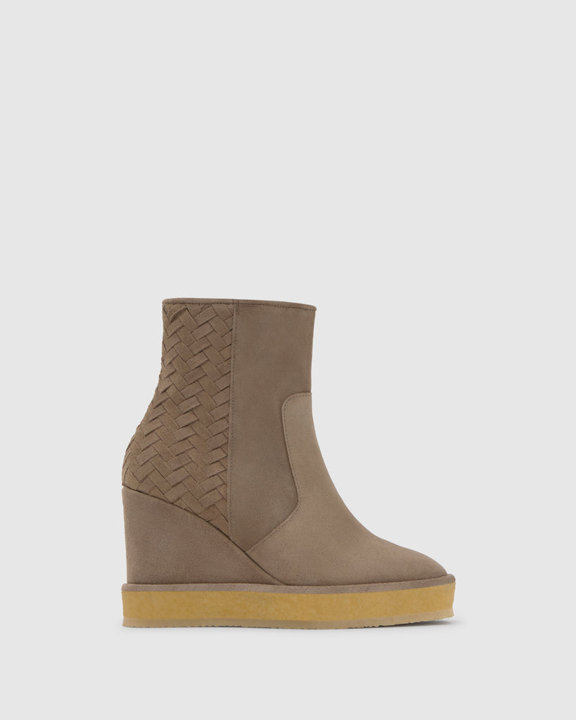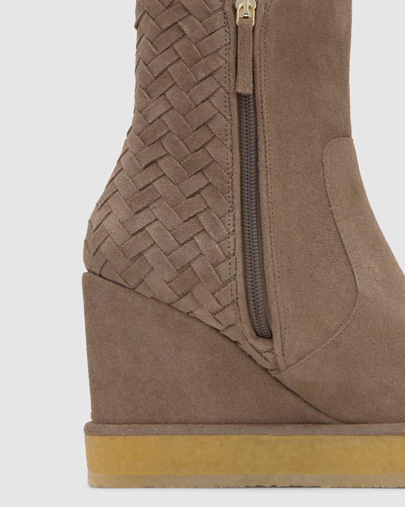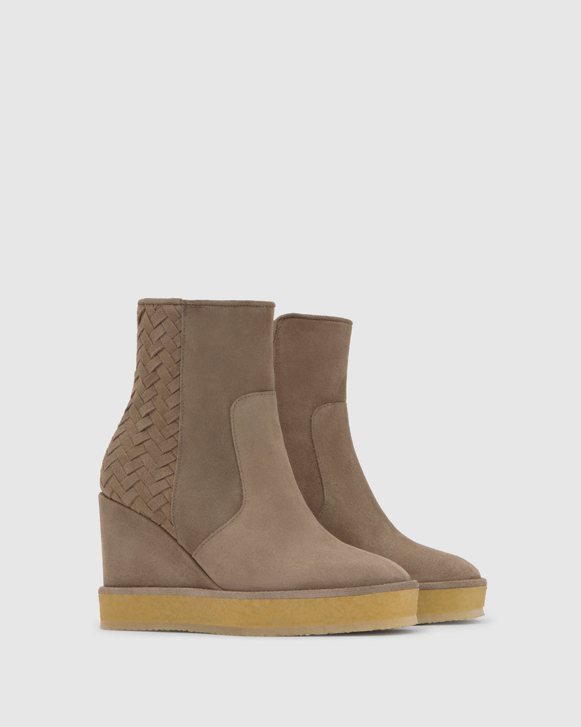 Botín Brelia en serraje con intrecciato en la caña, cierre de cremallera, plantilla acolchada y cuña de 10cm forrada a juego con plataforma a contraste.