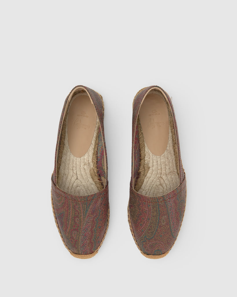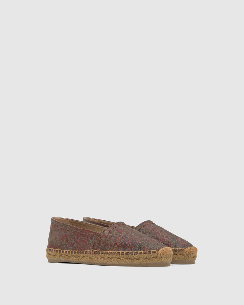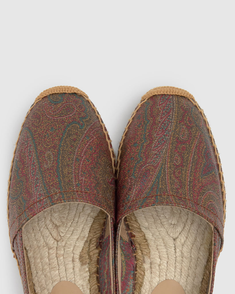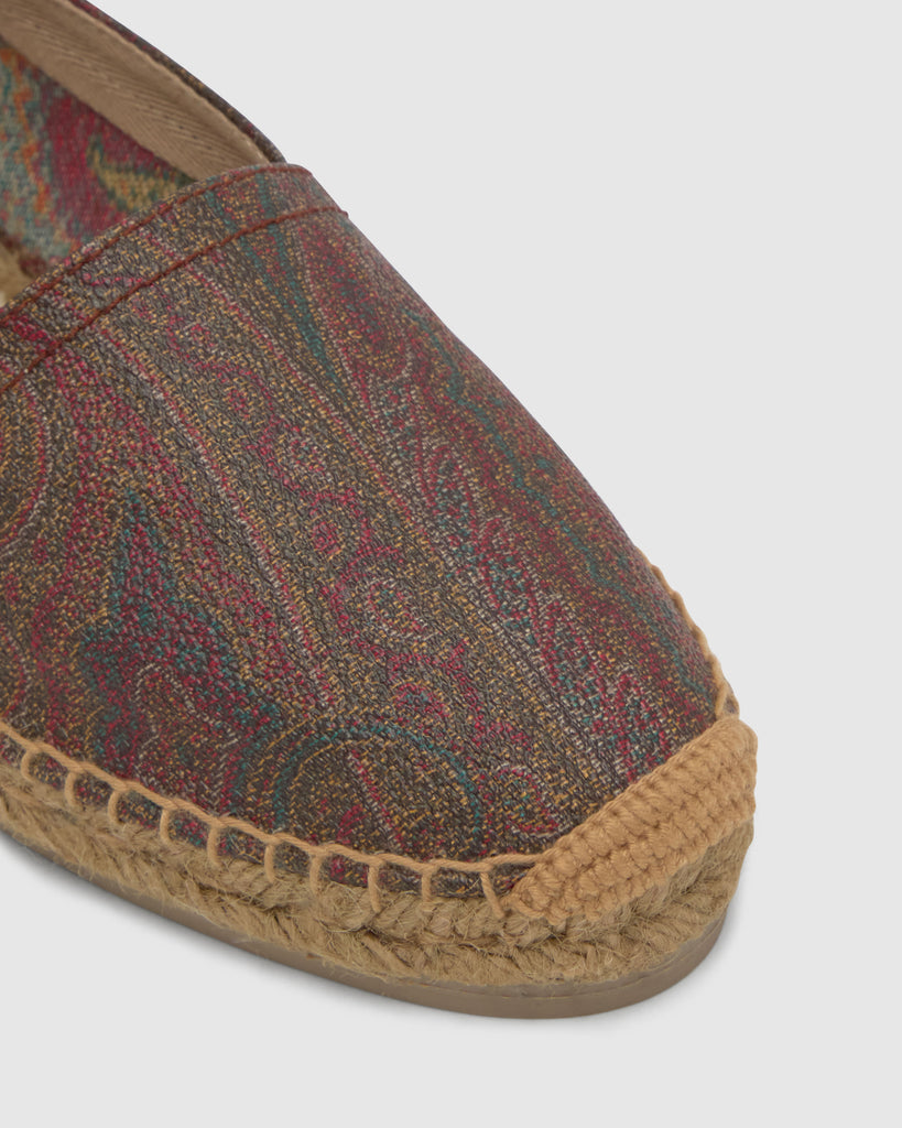 Alpargata plana Kenda estilo camping en el icónico tejido jacquard de ETRO con acabado engomado y la característica suela de yute taupe de Castañer.
