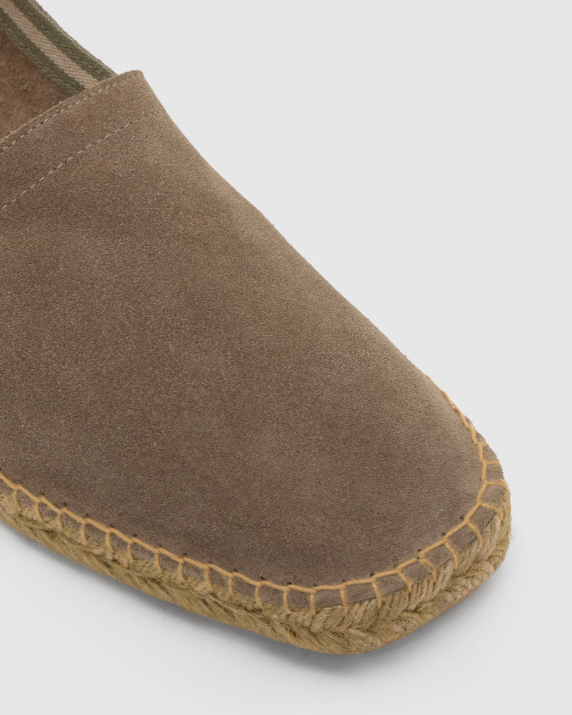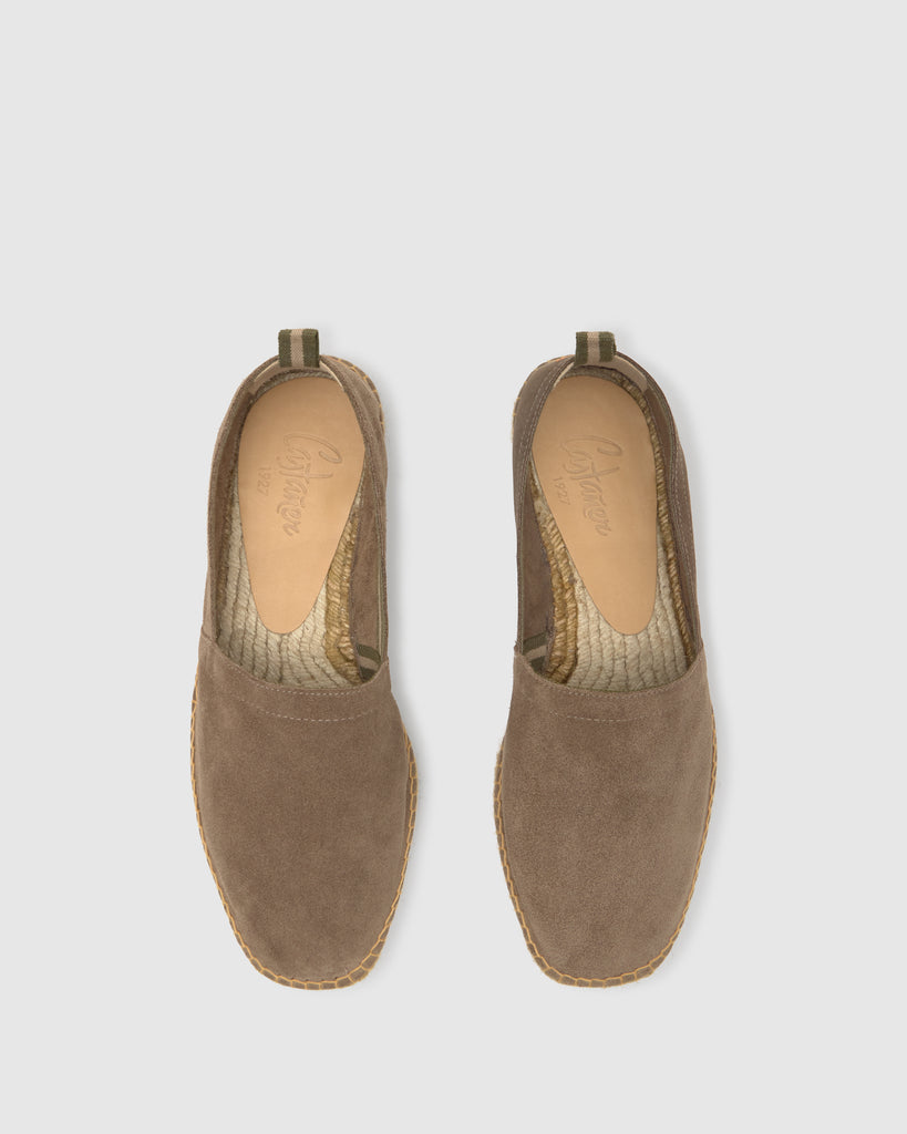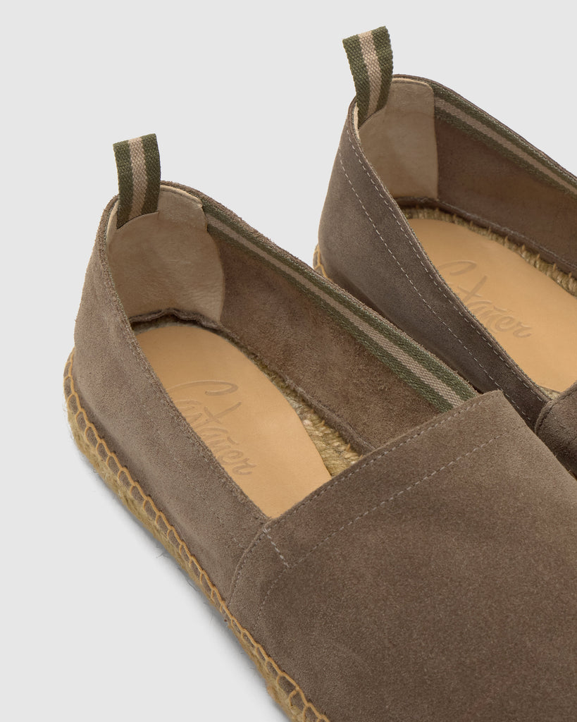 Icónica alpargata Pablo estilo camping en serraje y suela de yute taupe.