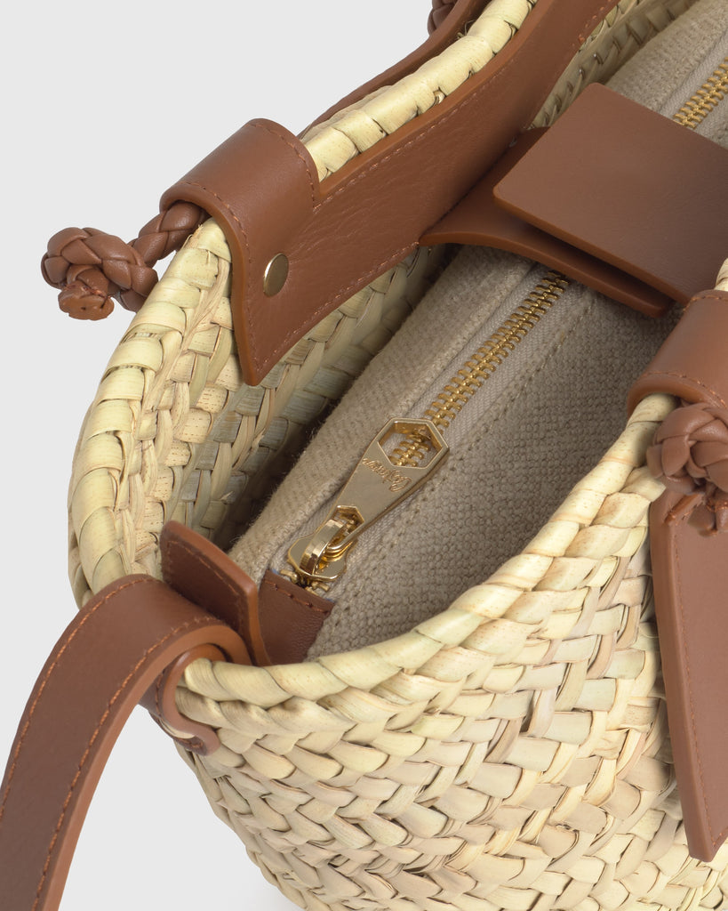Capazo Campania Mini en rafia natural con bolsillo exterior en cuero y el logo Castañer perforado. Bolsa interior extraíble con cremallera, cierre magnético y asas de cuero cortas y largas para llevar del hombro.