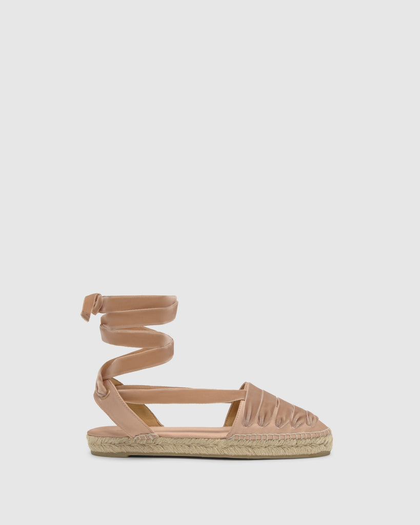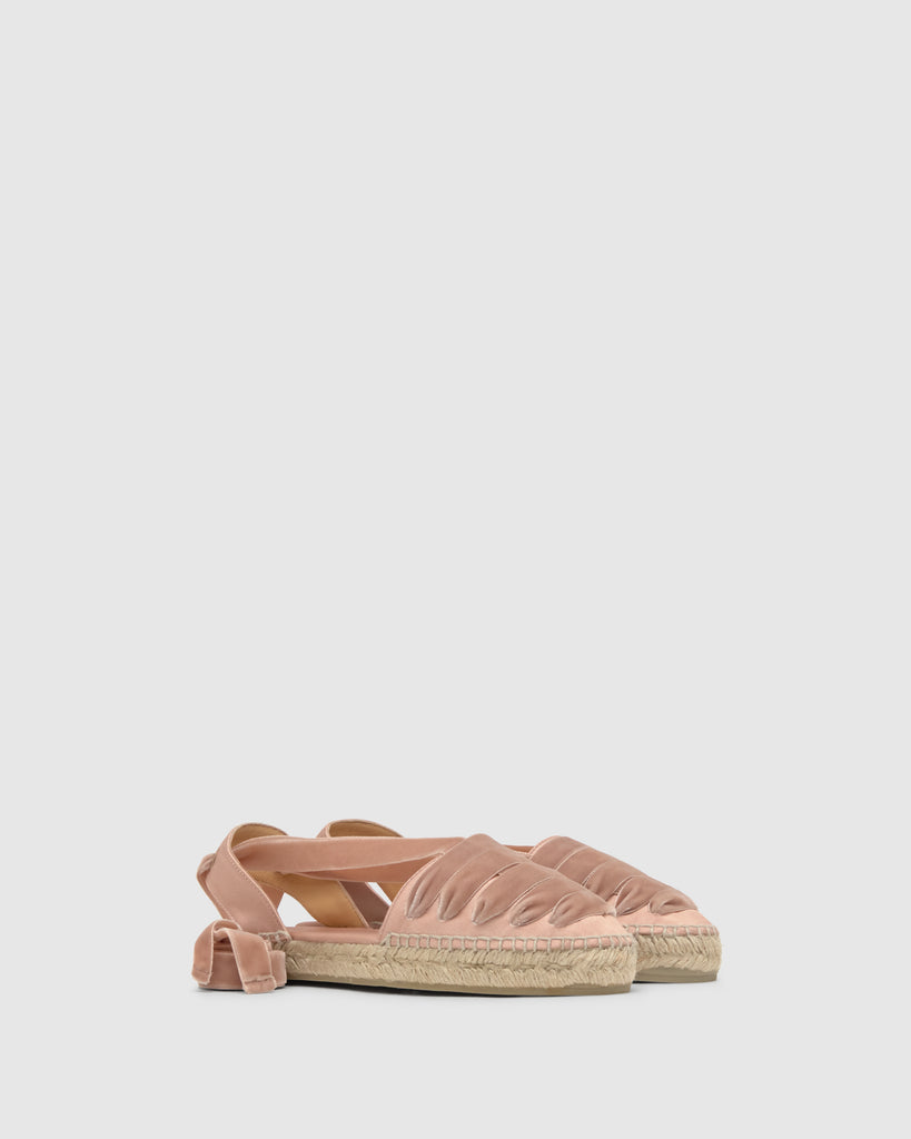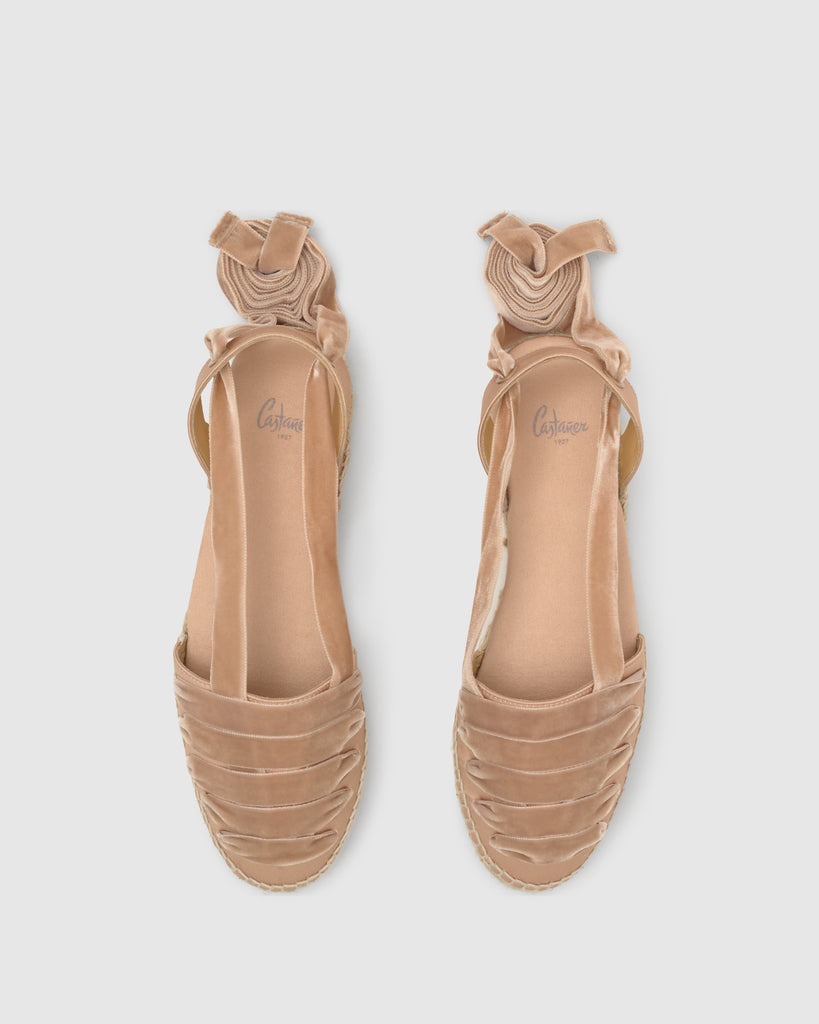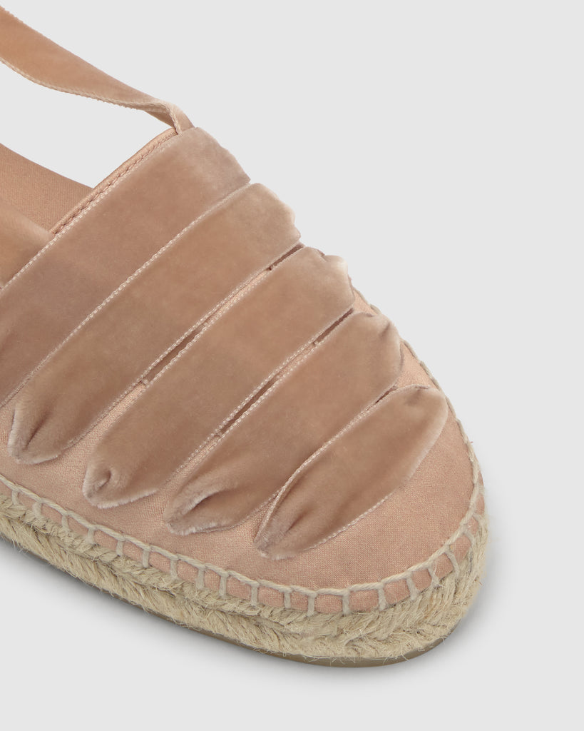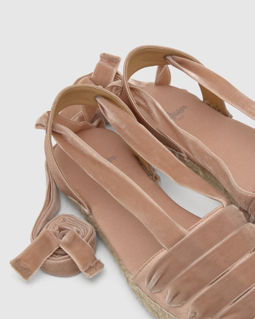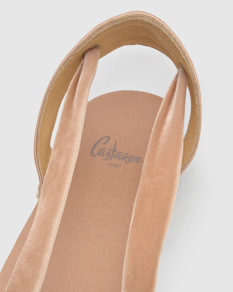 Icónica alpargata embetada Kimita en raso con cintas de terciopelo y suela de yute.