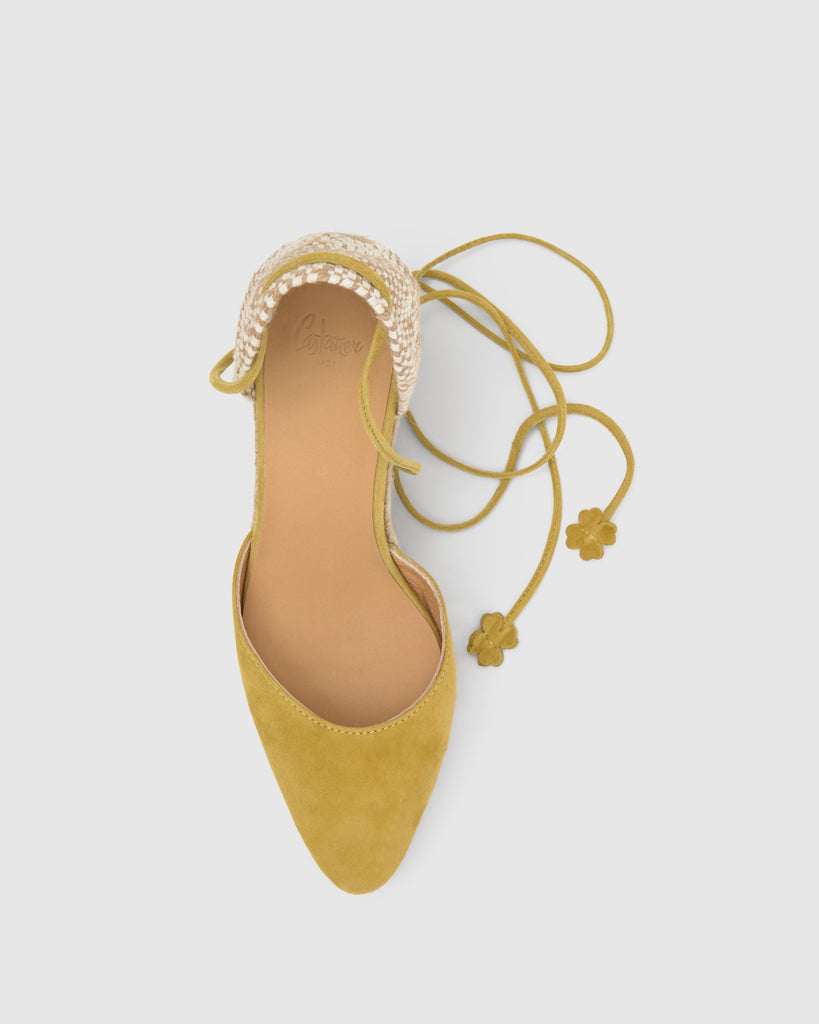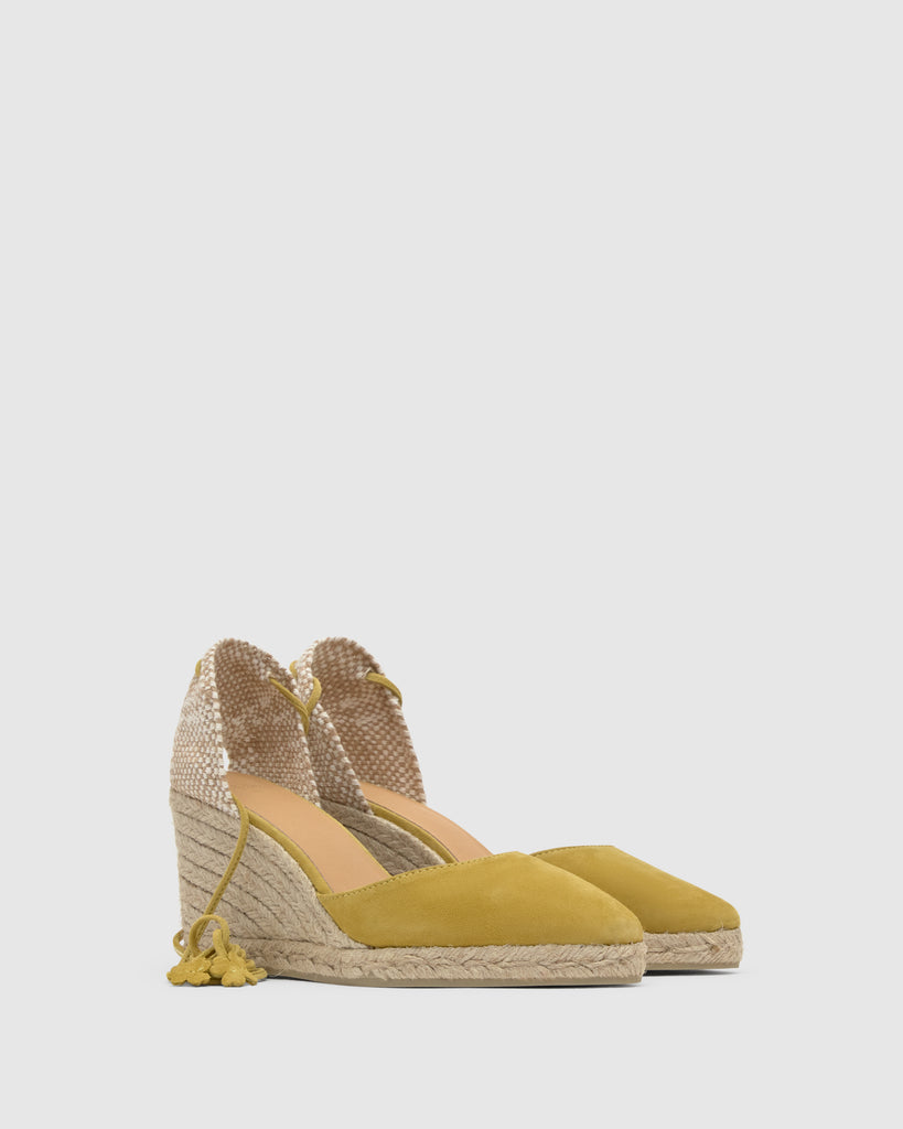 Icónica alpargata Joyce en ante con cierre de cordones a juego, plantilla acolchada y punta afilada. Cuña de yute de 9cm.