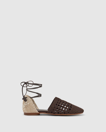Alpargata plana Gonza en ante trenzado a mano, con un trabajo artesanal que entrelaza cada hebra a lo largo de más de 40 pasos manuales. Cuenta con cierre de cordones a juego y plantilla acolchada.