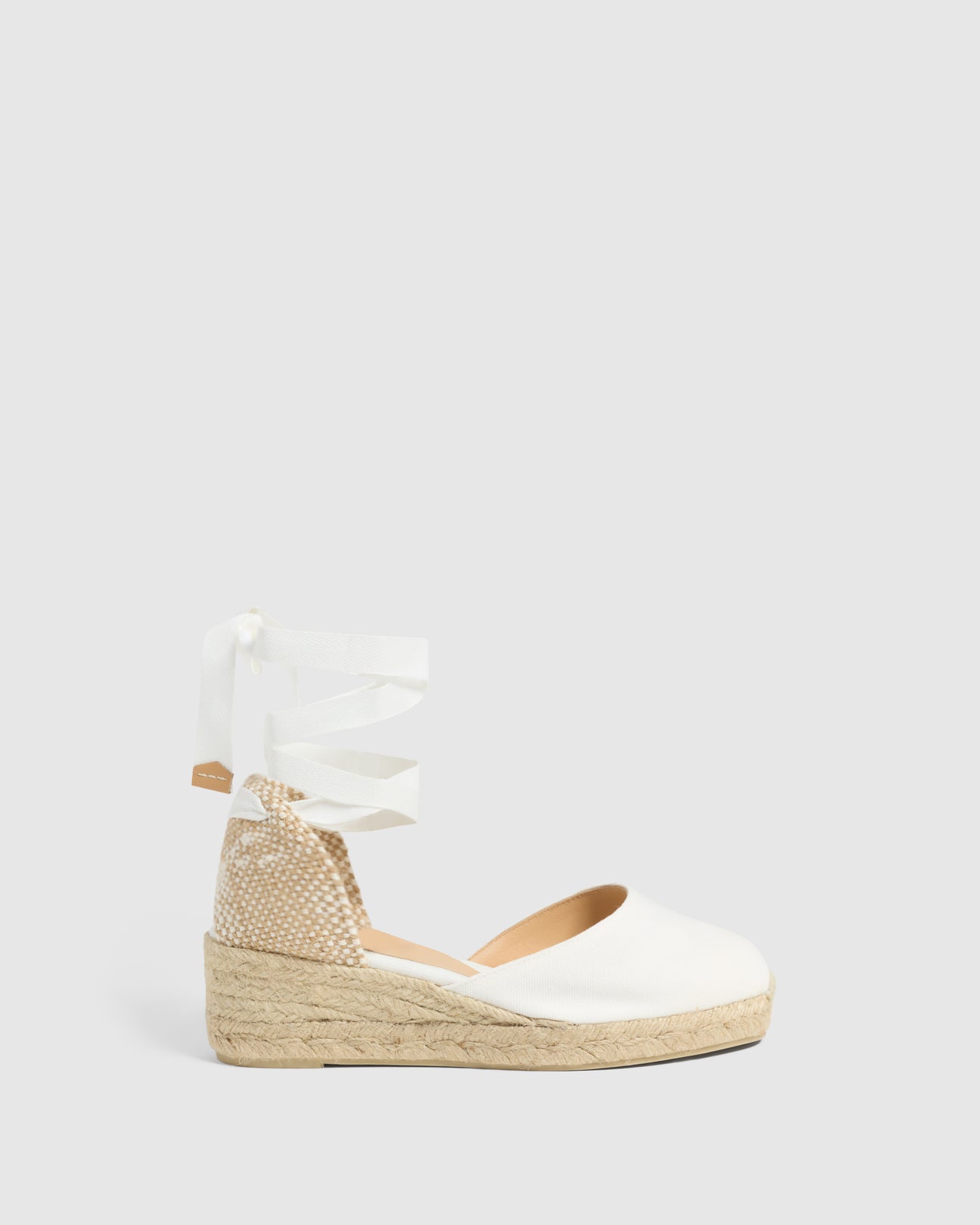 Icónica alpargata Carina en algodón orgánico con cierre de lazada, plantilla acolchada y cuña de yute de 5 cm.