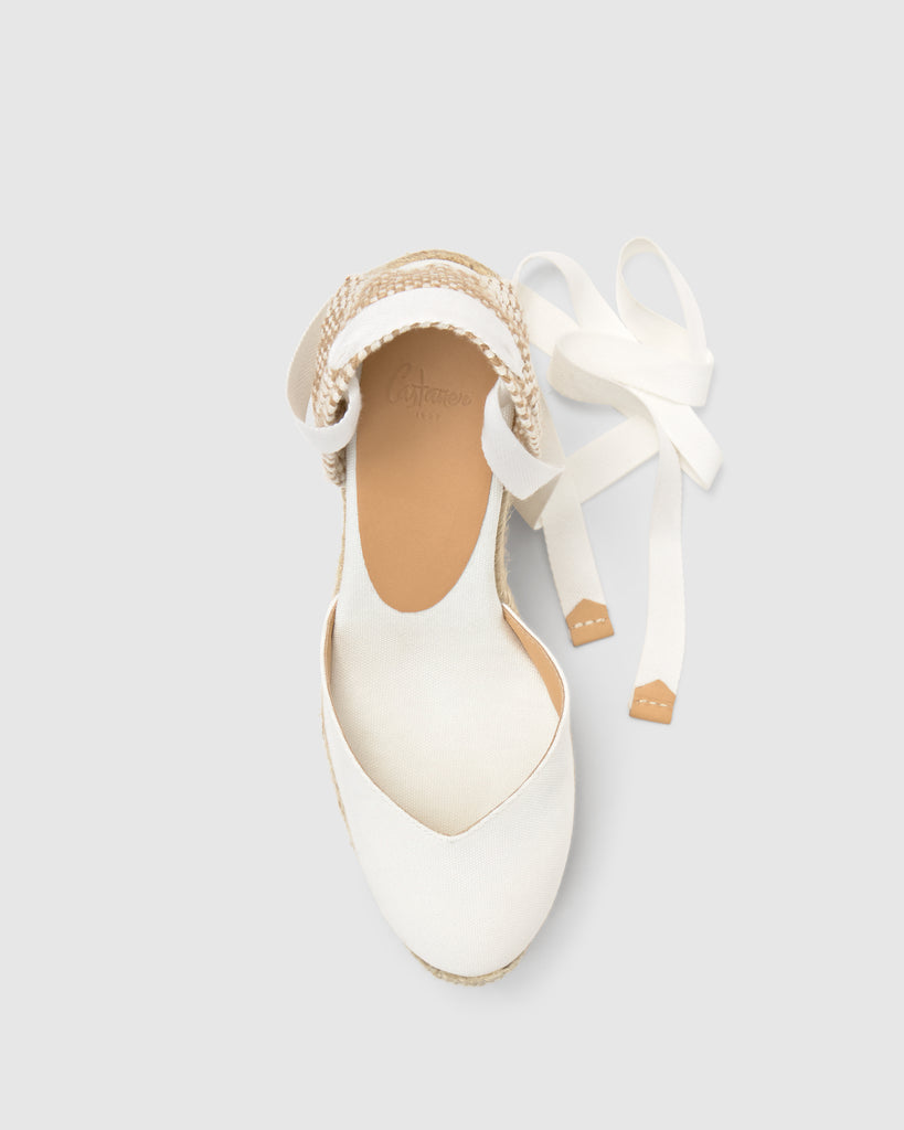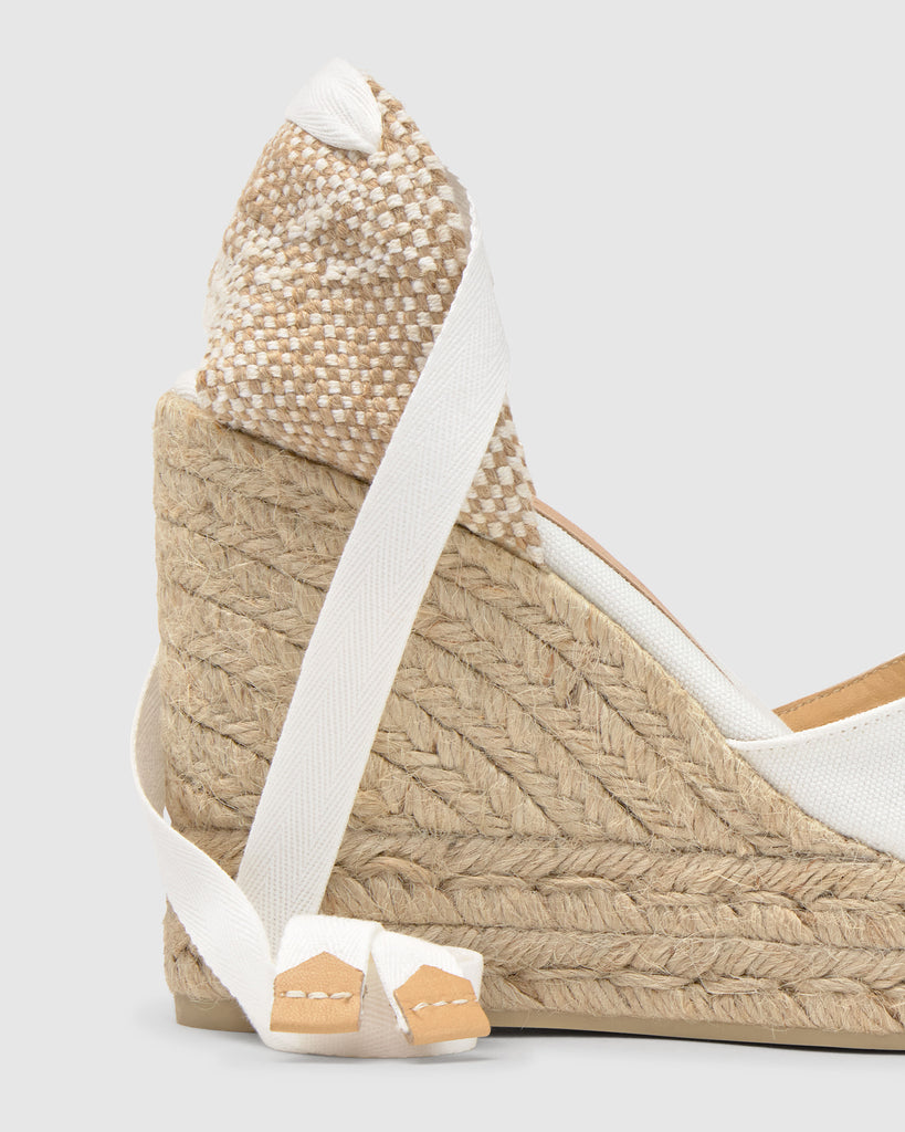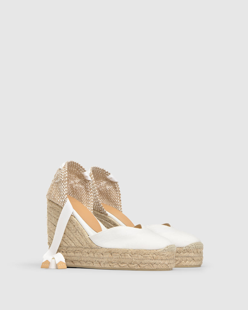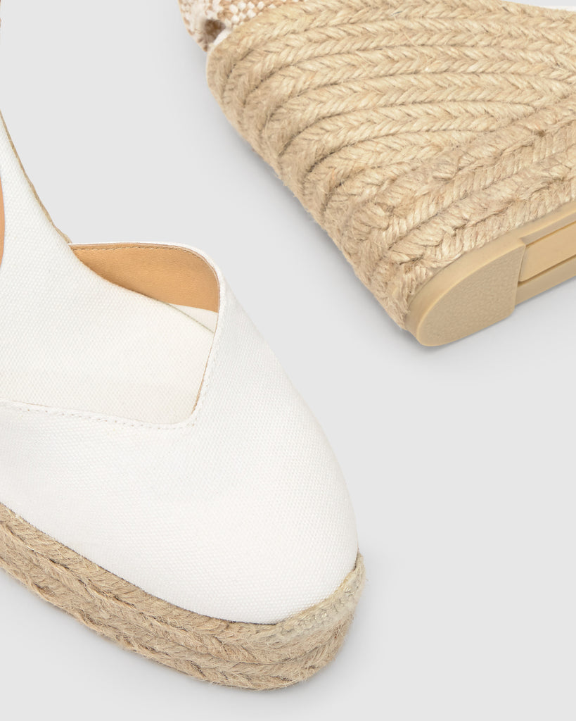 Emana estilo único con Chiara, las icónicas alpargatas que te acompañarán en tus mejores ocasiones. Confeccionadas en España en algodón orgánico, las alpargatas Chiara presentan escote a V, puntera cerrada redondeada, cierre mediante lazada, cuña de 11cm con doble plataforma de yute y suela de caucho vulcanizado.