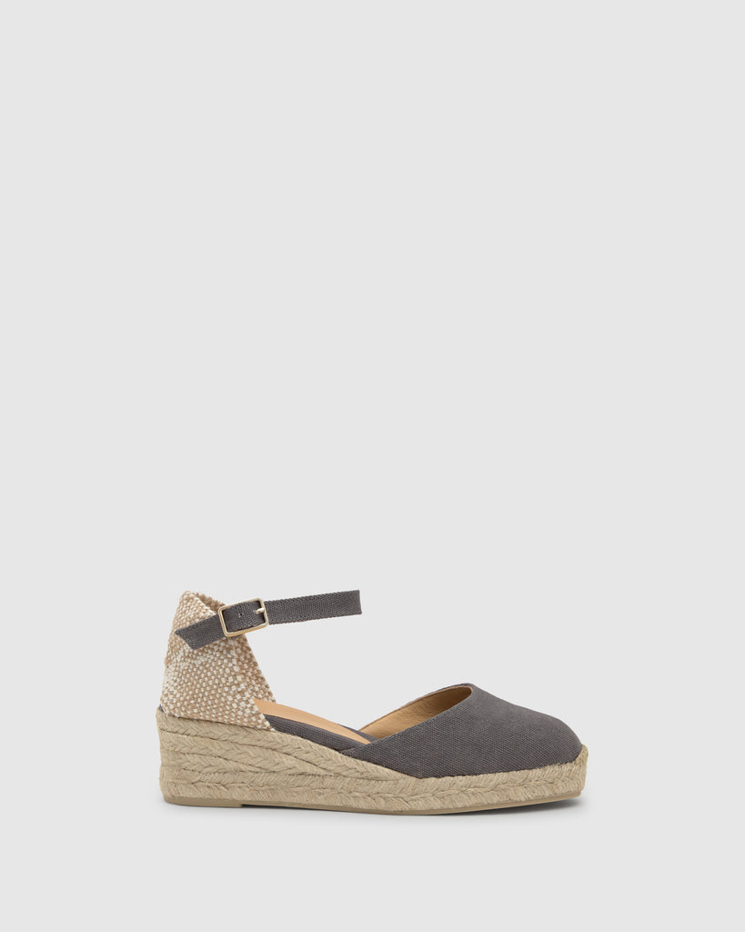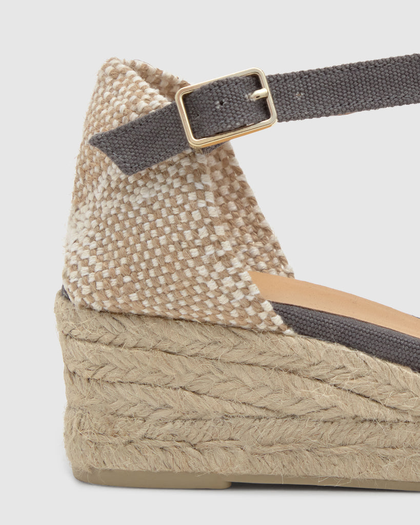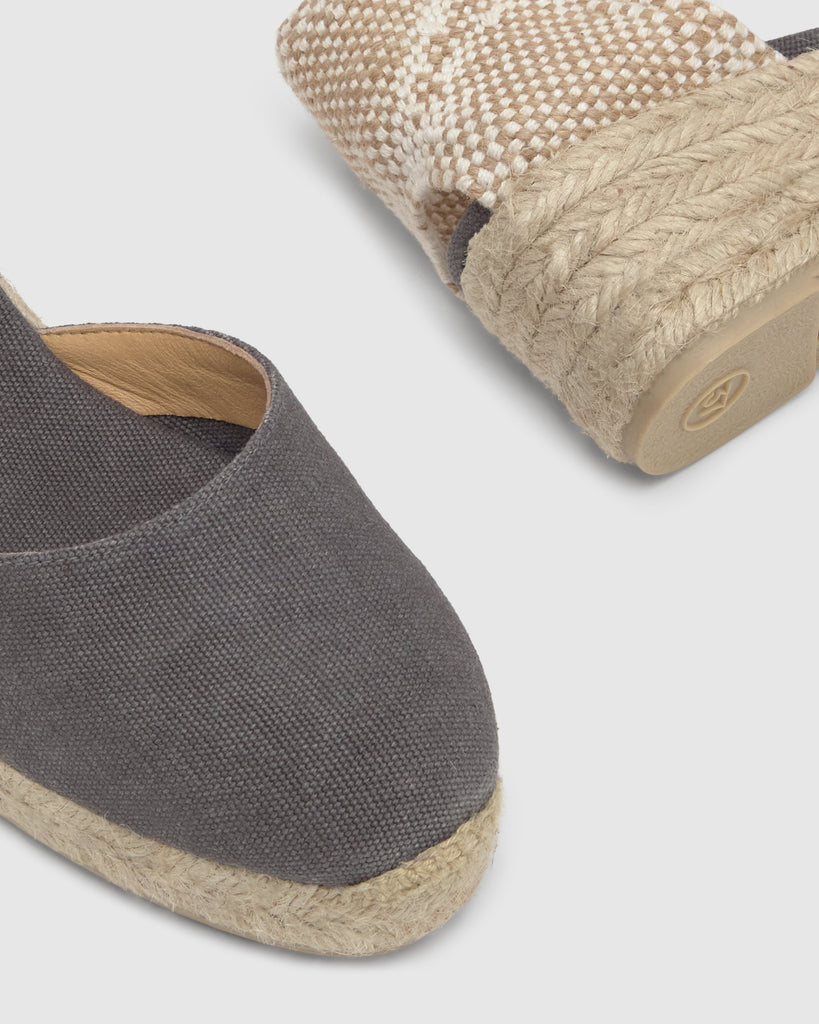 Icónica alpargata Carol en algodón orgánico lavado con cierre de pulsera, plantilla acolchada y cuña de yute de 5 cm.