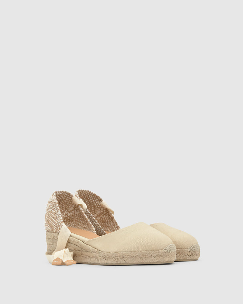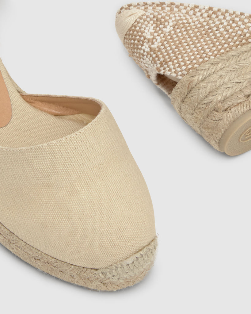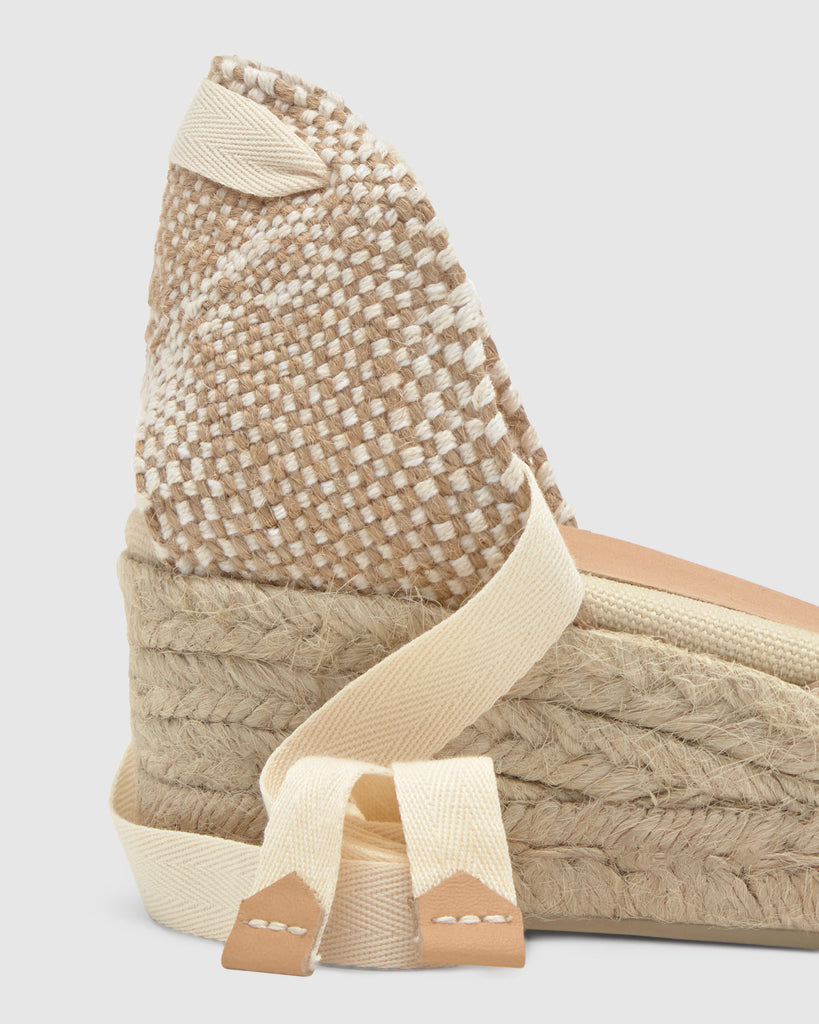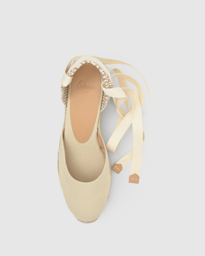 Icónica alpargata Carina en algodón orgánico con cierre de lazada, plantilla acolchada y cuña de yute de 5 cm.