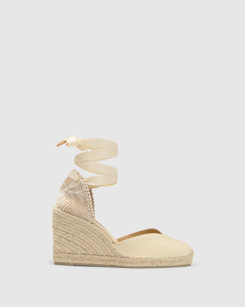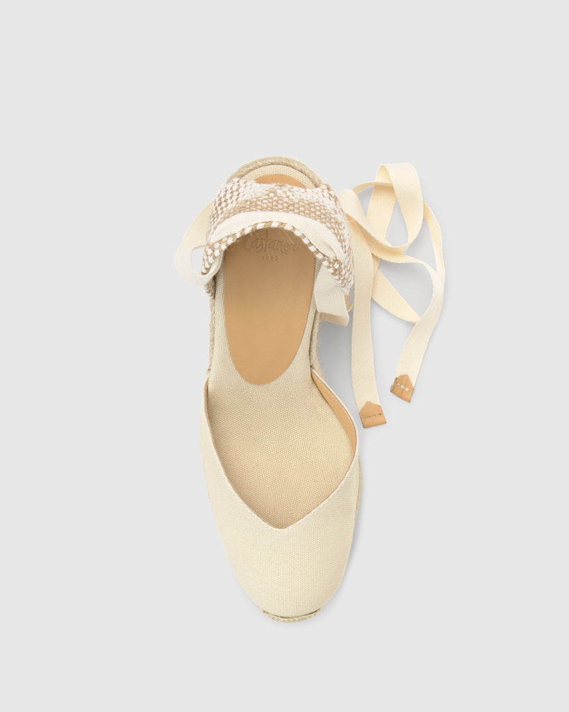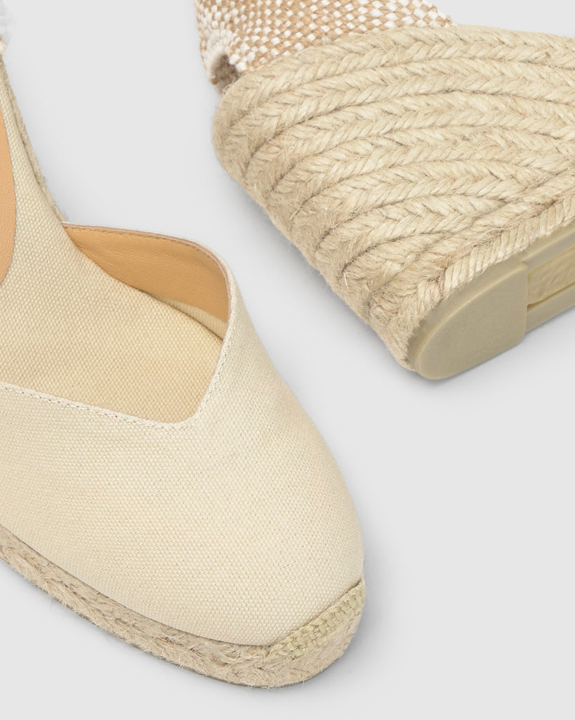 Emana estilo único con Chiara, las icónicas alpargatas que te acompañarán en tus mejores ocasiones. Confeccionadas en España en algodón orgánico, las alpargatas Chiara presentan escote a V, puntera cerrada redondeada, cierre mediante lazada, cuña de 9cm y suela de caucho vulcanizado.
