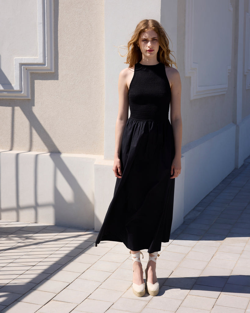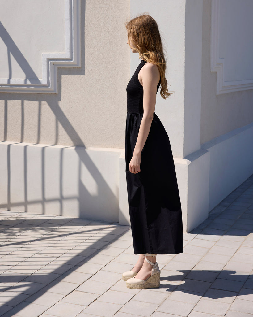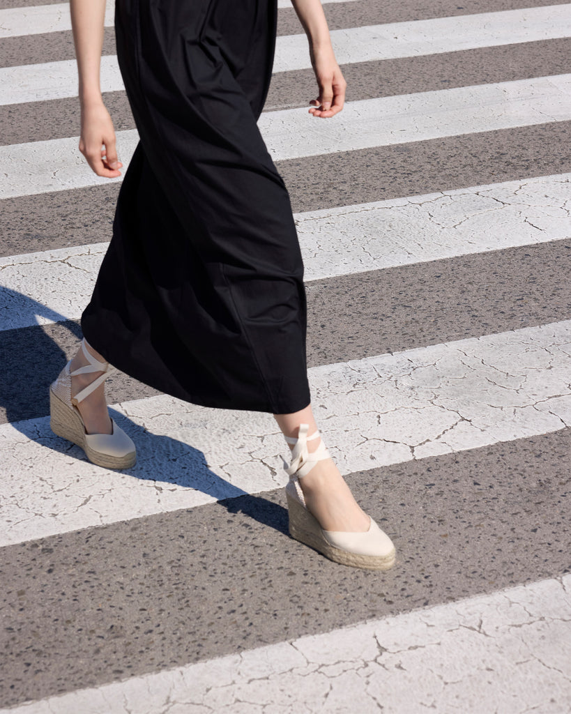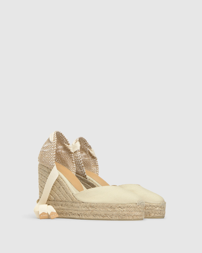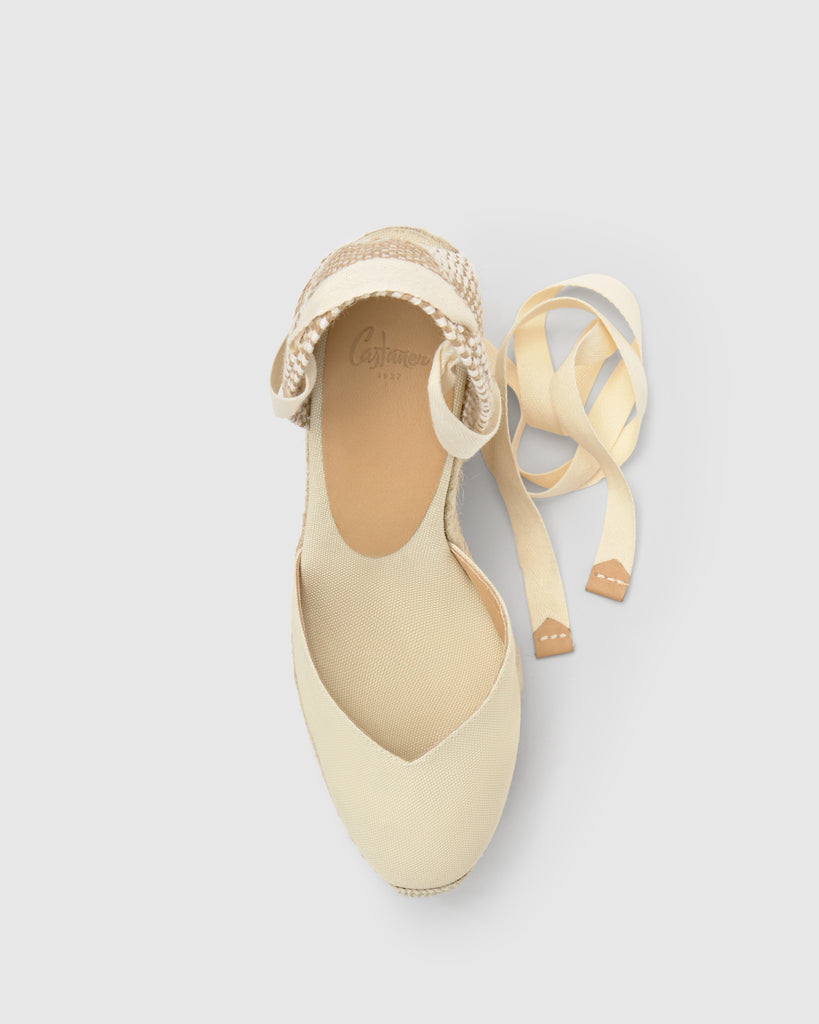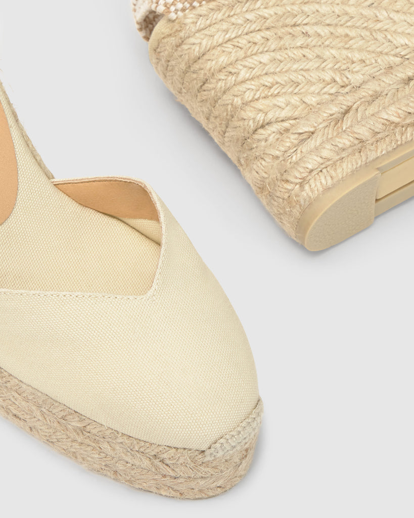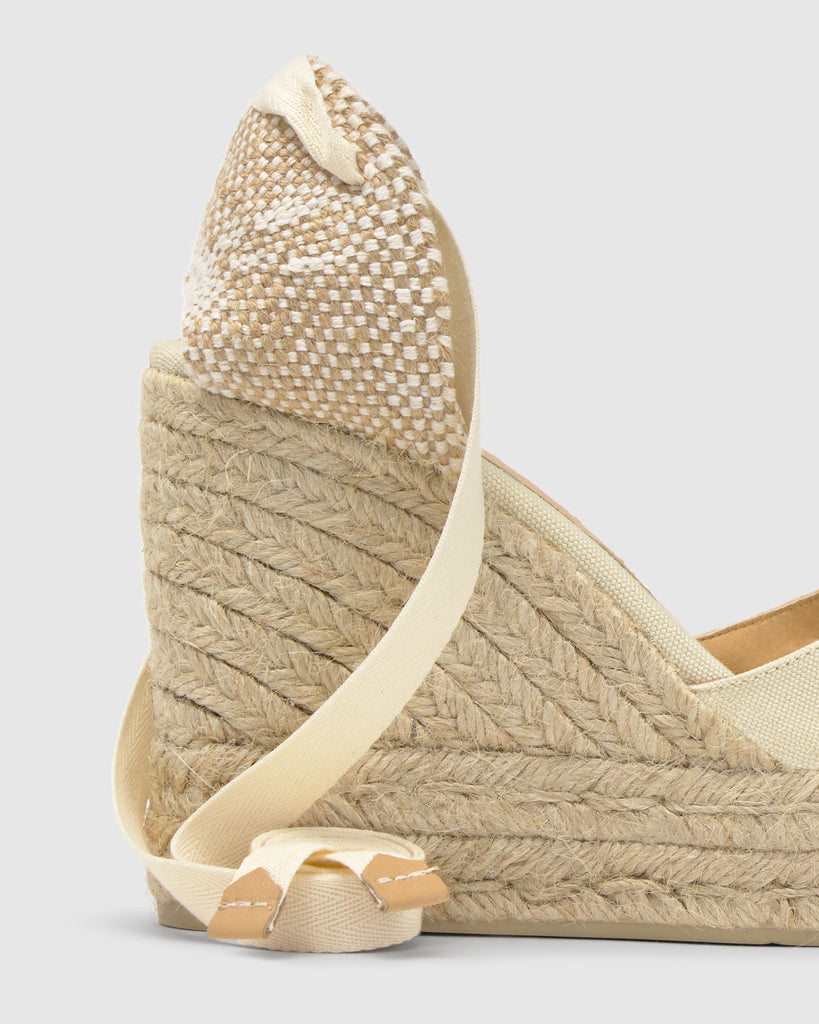 Alpargata Chiara en algodón orgánico con cierre de lazo, plantilla acolchada y escote en V. Cuña de yute de 11cm con doble plataforma.