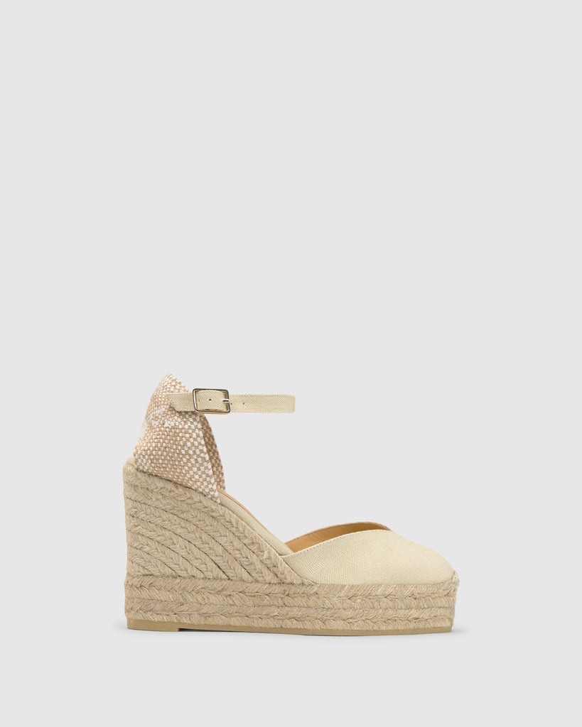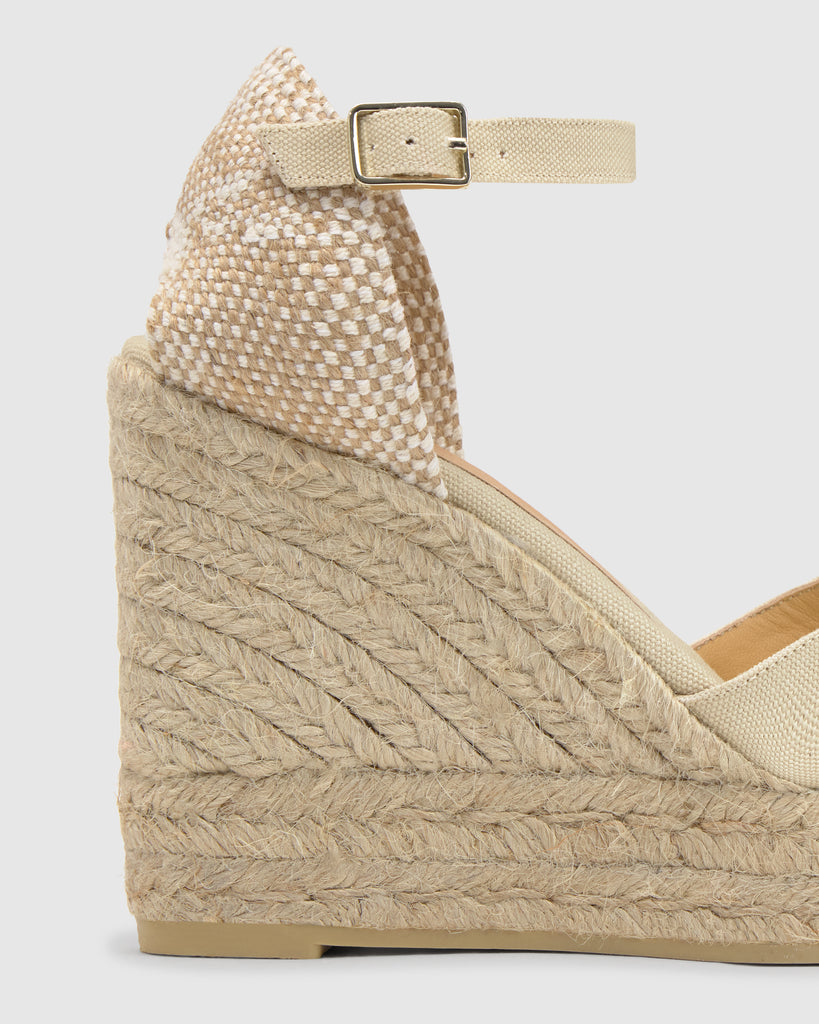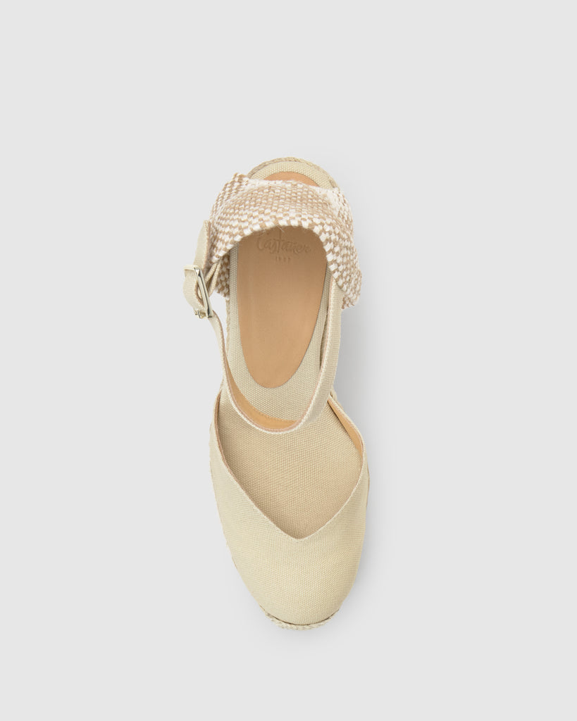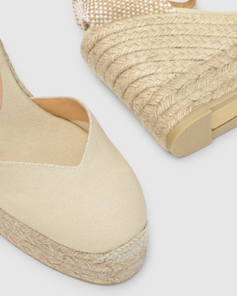 Chiarita, un modelo singular y representativo de la firma. Confeccionadas en España artesanalmente en algodón orgánico, las alpargatas Chiarita presentan puntera cerrada redondeada, cierre lateral de pulsera con hebilla metálica, cuña de 11cm con doble plataforma de yute y suela de caucho vulcanizado.