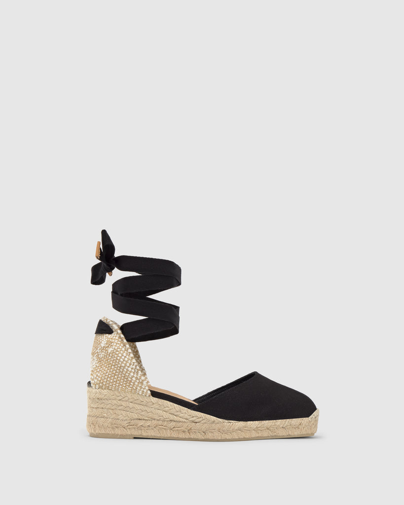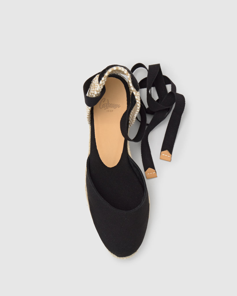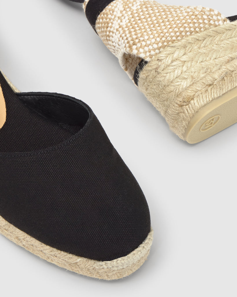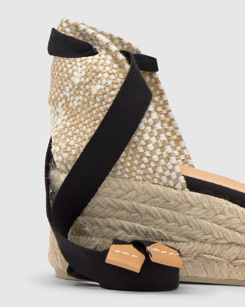 Icónica alpargata Carina en algodón orgánico con cierre de lazada, plantilla acolchada y cuña de yute de 5 cm.