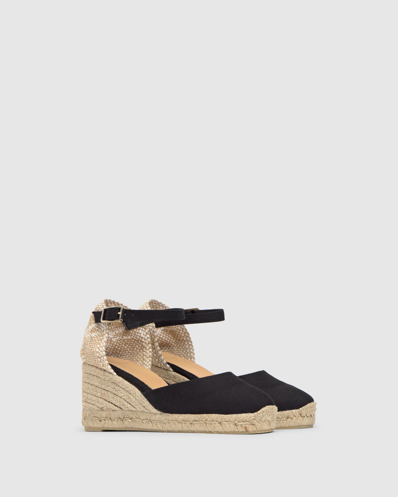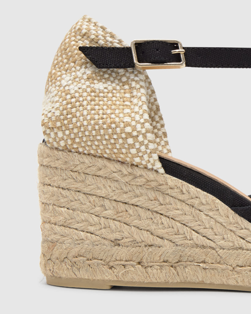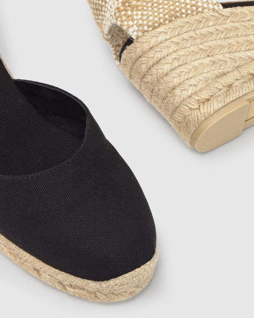 Icónica alpargata Carol en algodón orgánico con cierre de pulsera, plantilla acolchada y cuña de yute de 7 cm.