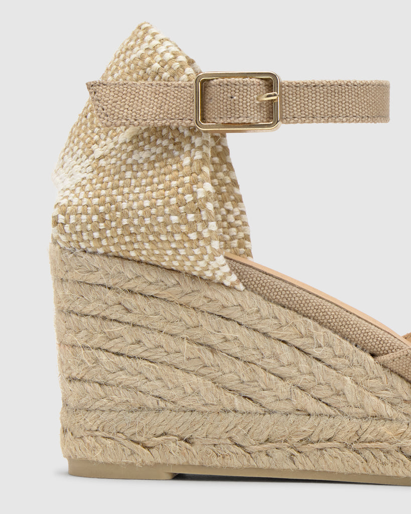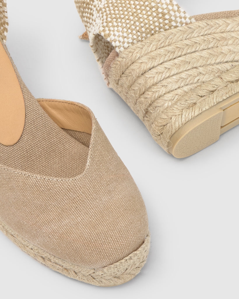 CHIARITA, UN MODELO SINGULAR Y REPRESENTATIVO DE LA FIRMA. CONFECCIONADAS EN ESPAÑA ARTESANALMENTE EN ALGODÓN ORGÁNICO LAVADO Y ACABADO LAVADO SOSTENIBLE. LAS ALPARGATAS CHIARITA PRESENTAN PUNTERA CERRADA REDONDEADA, CIERRE LATERAL DE PULSERA CON HEBILLA METÁLICA, CUÑA DE 7 CM Y SUELA DE CAUCHO VULCANIZADO.