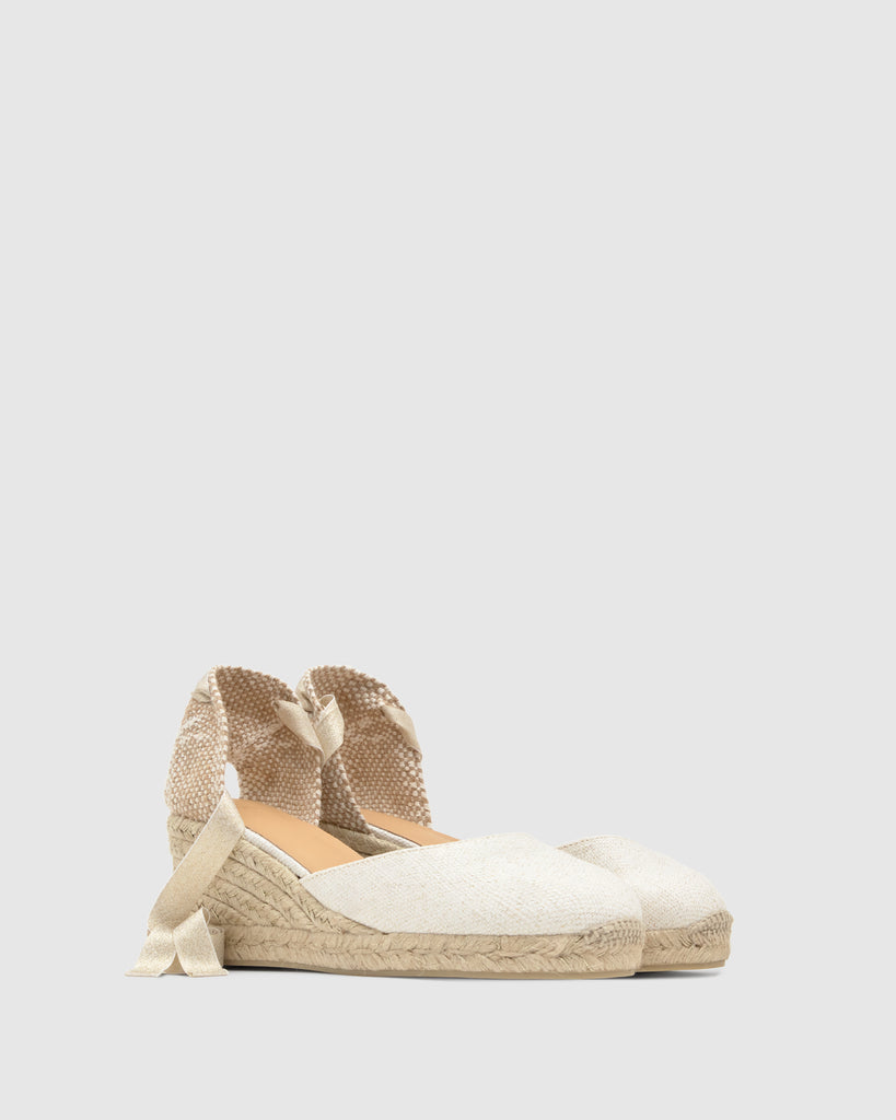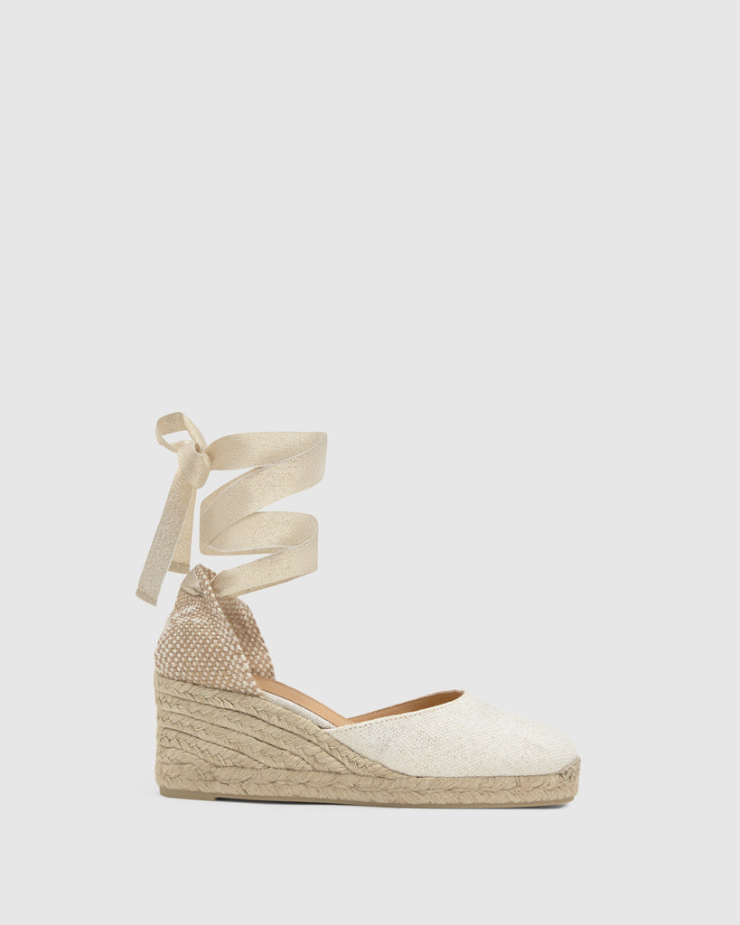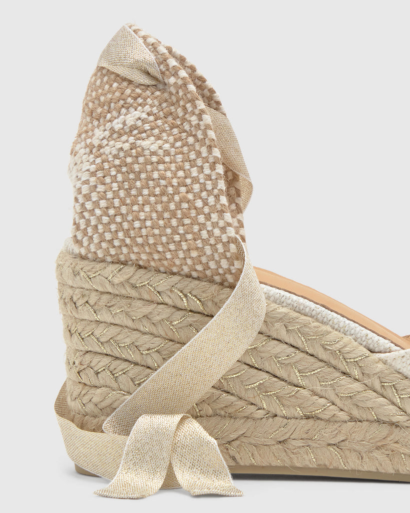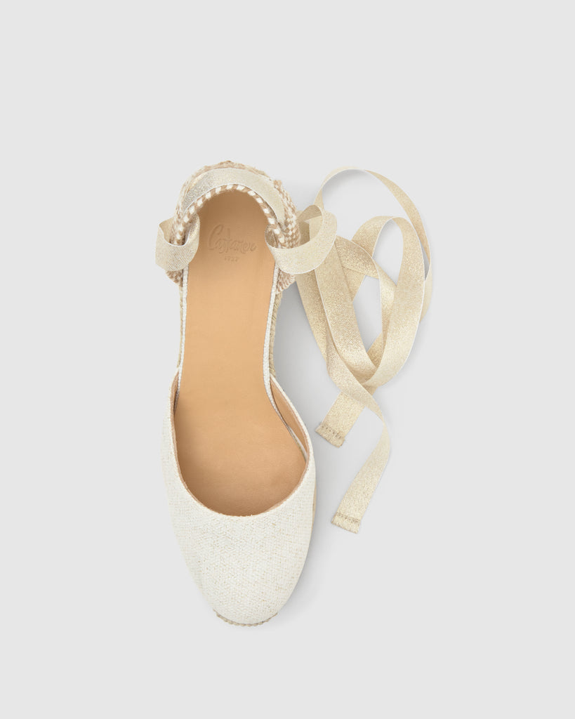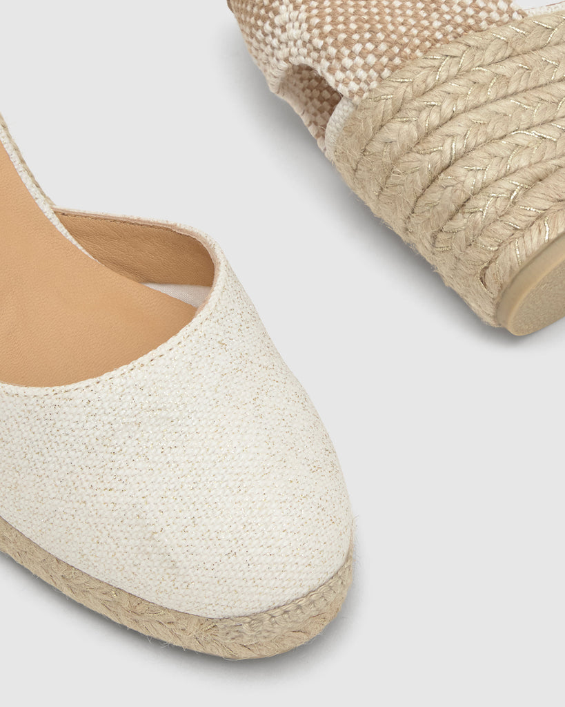 Icónica alpargata Carina en lino metalizado con cierre de lazada, plantilla acolchada y cuña de yute y lurex de 7cm.