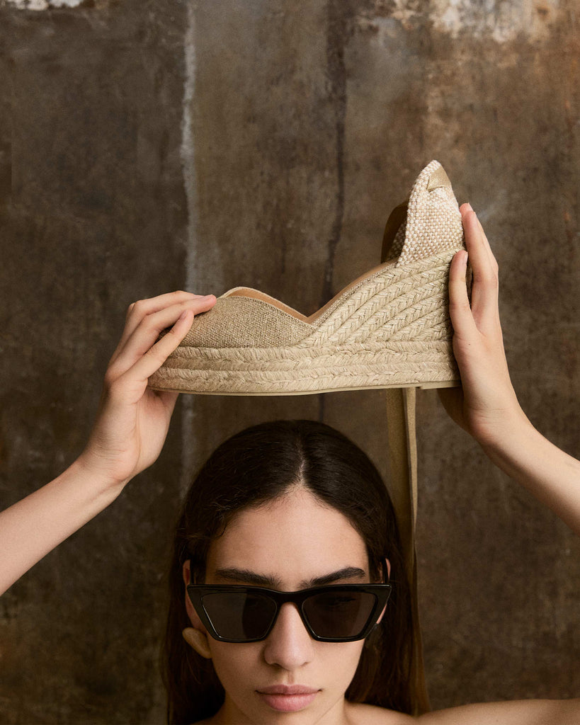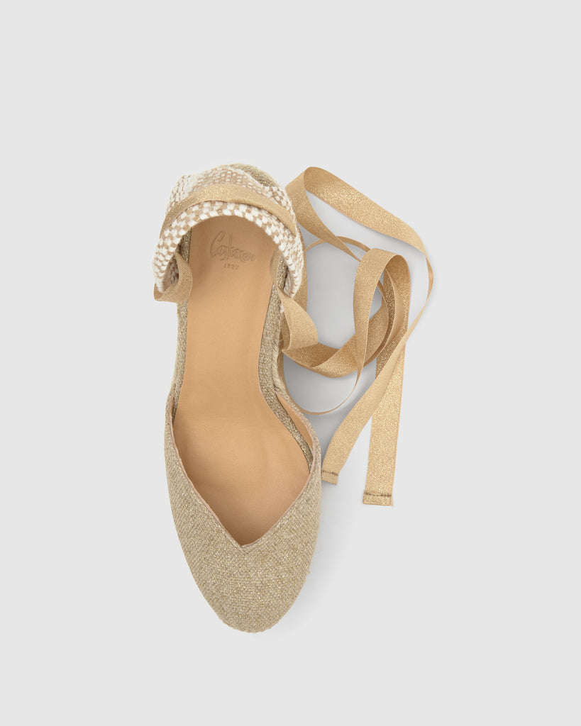 Icónica alpargata Chiara en lino metalizado con cierre de cintas, plantilla acolchada y escote en V. Cuña de yute y lurex de 11cm con doble plataforma.