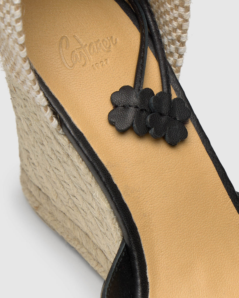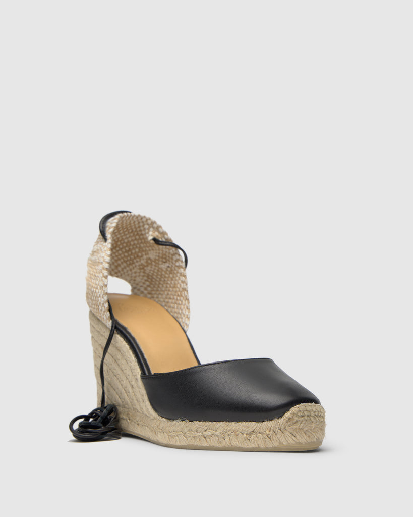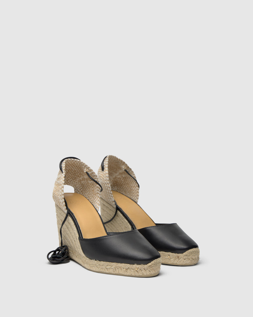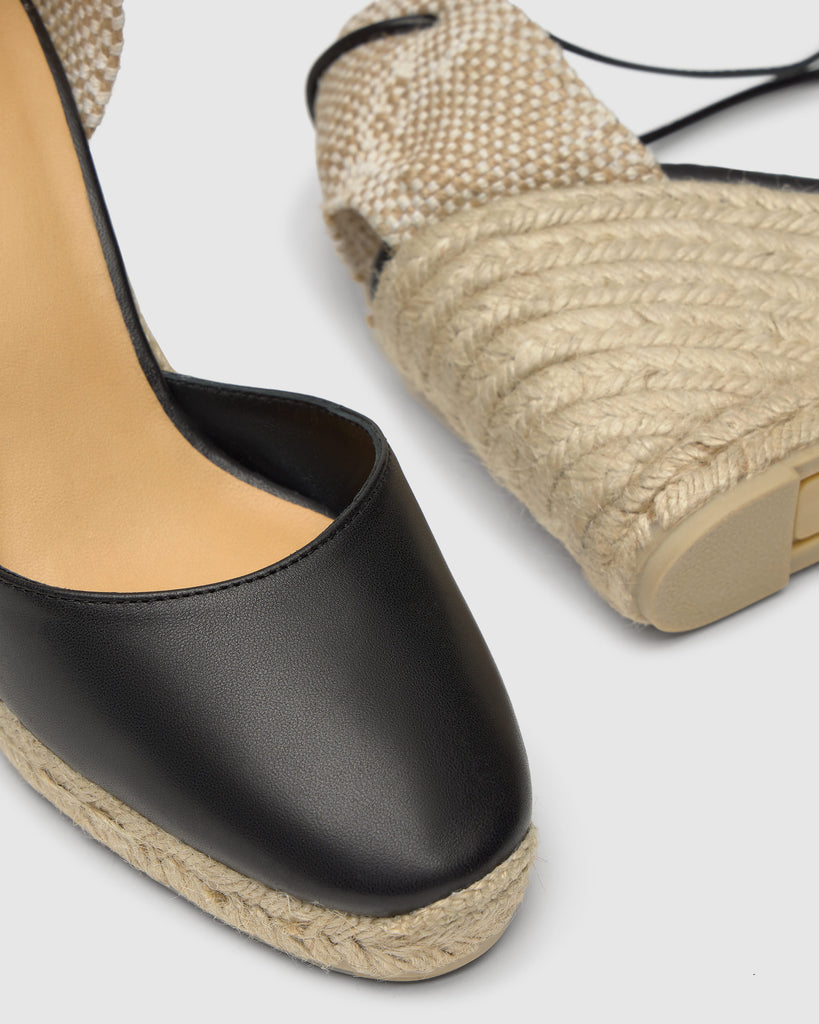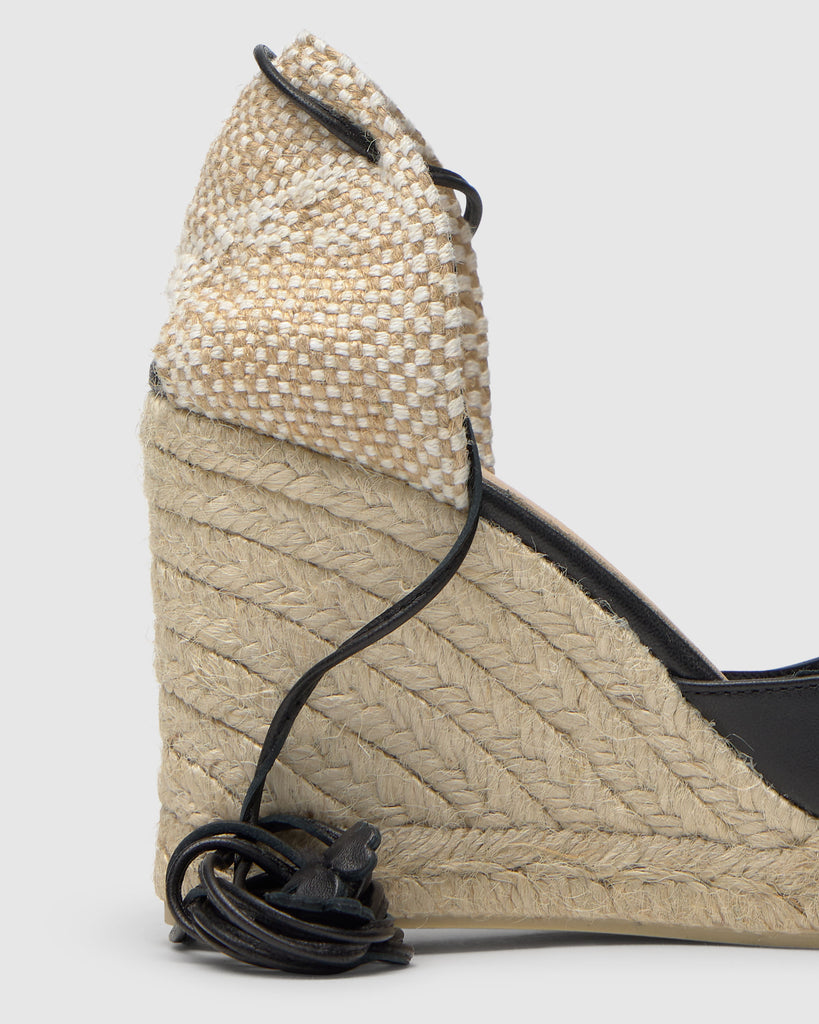 Alpargata Carina en napa con cierre de cordón de cuero, plantilla acolchada y cuña de yute de 9 cm.