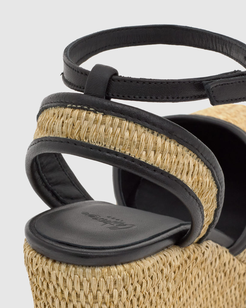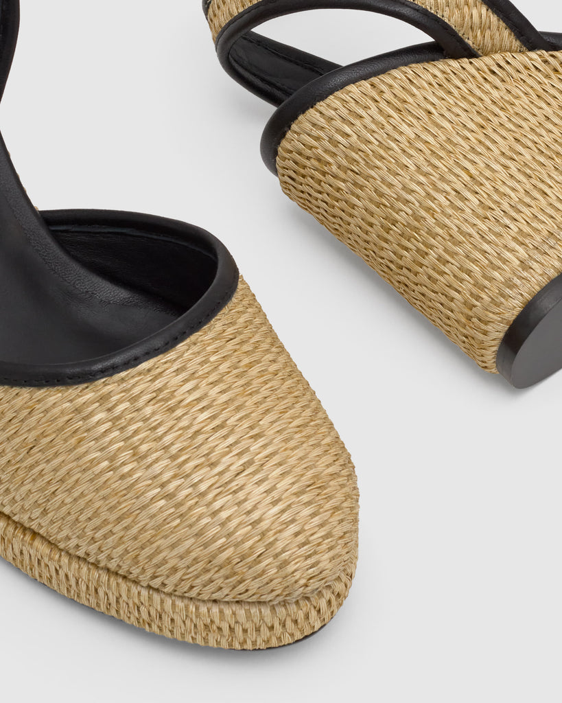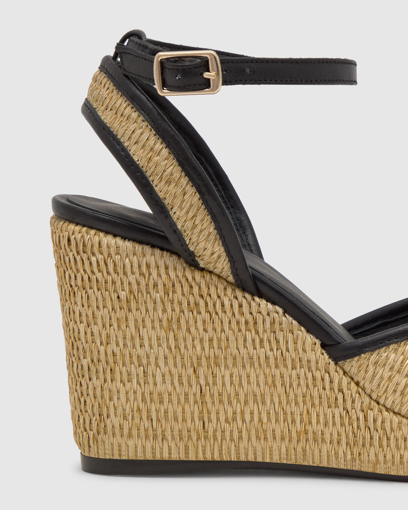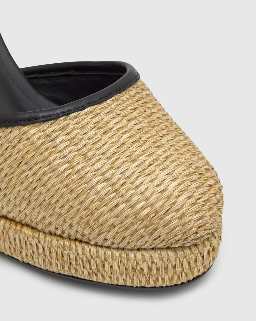 Alpargata Cass en napa y rafia con cierre de pulsera, plantilla acolchada y cuña de 9 cm forrada en rafia natural.